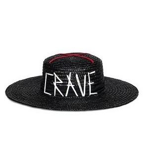 - Sombrero de paja negro ala ancha con bordado «Crave» de la colección Mae Couture.