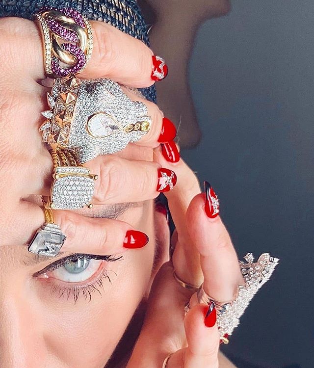 - Aretes realizados especialmente para Madonna en oro blanco, diamantes y rubíes modelo «Madame X» de Lana Jewerly.
