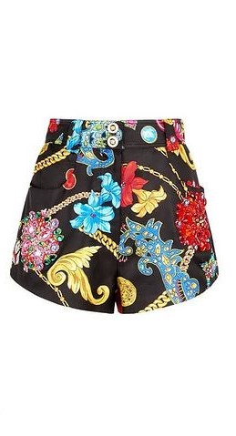 - Conjunto “Versace” de seda compuesto por chaqueta extragrande y shorts con estampado de flores, cadenas y arabescos coloridos sobre fondo negro modelo «Gioielleria Jetés» de la última colección primavera-verano 2019.