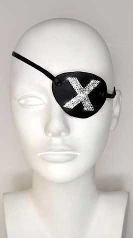 - Parche de ojo de cuero negro con aplicación de «X» en cristales hecho a medida por Gregory Kara.
