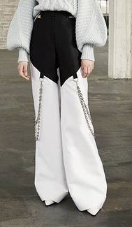 - Pantalones anchos de seda blanco y negro con aplicaciones de cadenas modelo «Blocked» de la colección otoño-invierno 2019 de Victoria Hayes.