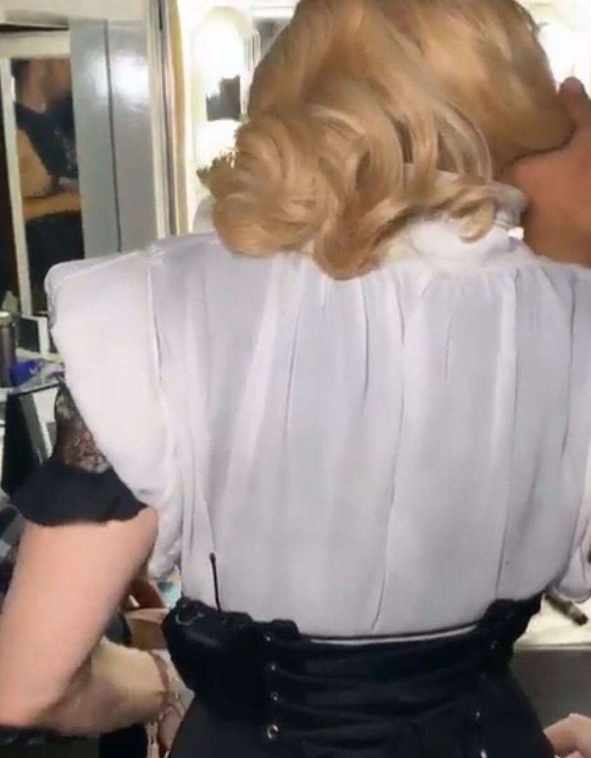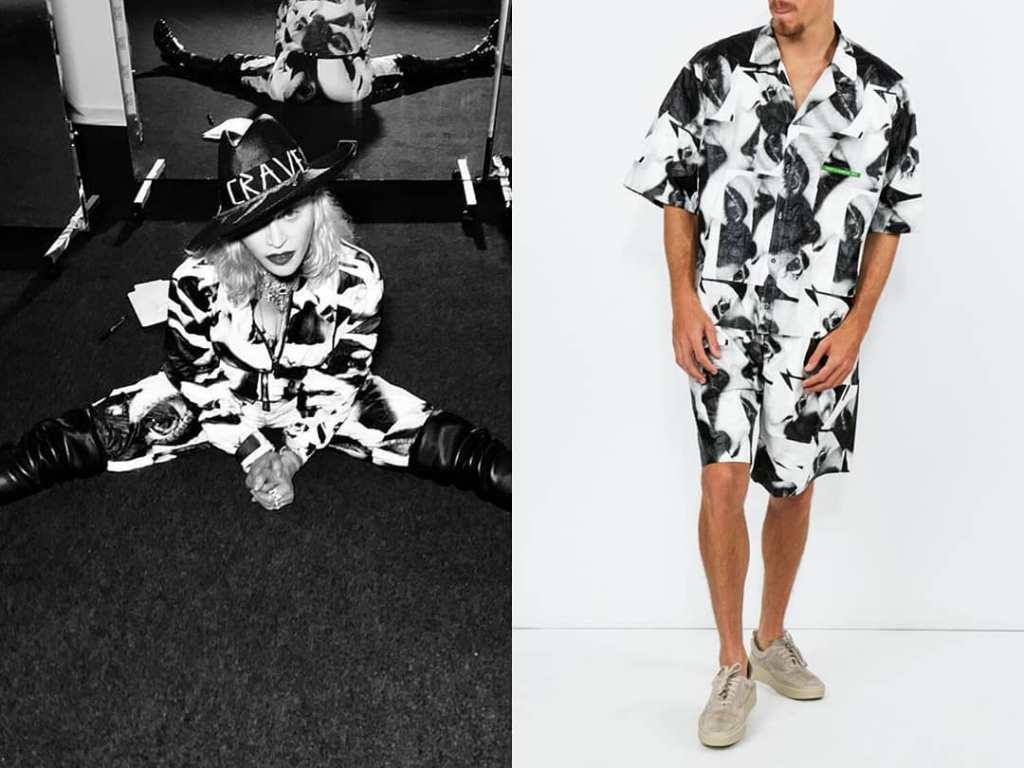 Algunas de las prendas que Madonna usó durante los workshop de «The Madame X Tour». Un conjunto estampado con fotografía de Mert & Marcus con rostro abstracto en blanco y negro de algodón consistente en camisa mangas corta y short para hombre de la marca DSquare2. También la vimos probarse un saco con apliques en fantasía estilo mililtar modelo «Rock Star» de la diseñadora Elizabeth Emmanuel para la colección «Paris 1902».
