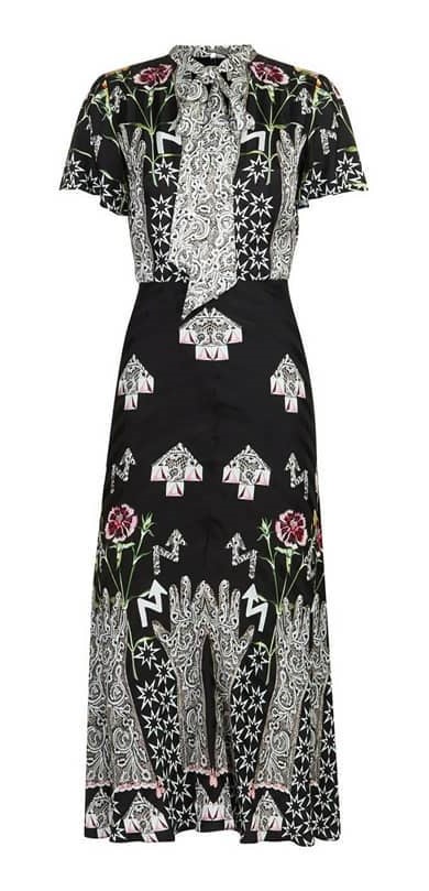 - Vestido negro de algodón, mangas cortas, moño en cuello, estampado geométrico en blanco y gris con bordados de flores de la firma Temperley London.