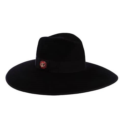 - Sombrero de ala ancha con hebilla de cristal en paño negro modelo «GG» de la marca Gucci.