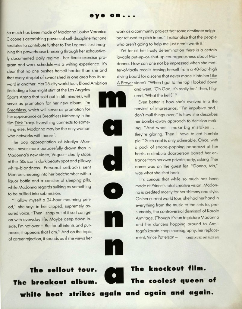 Madonna aparece en la portada de la edición junio de 1990 de la publicación americana «Harper’s Bazaar» con fotos de Jean Baptiste Mondino y ropa de Jean Paul Gaultier. Esta misma sesión de fotos se utilizó para la edición de Alemania lanzada en octubre y para la revista inglesa «The Face».