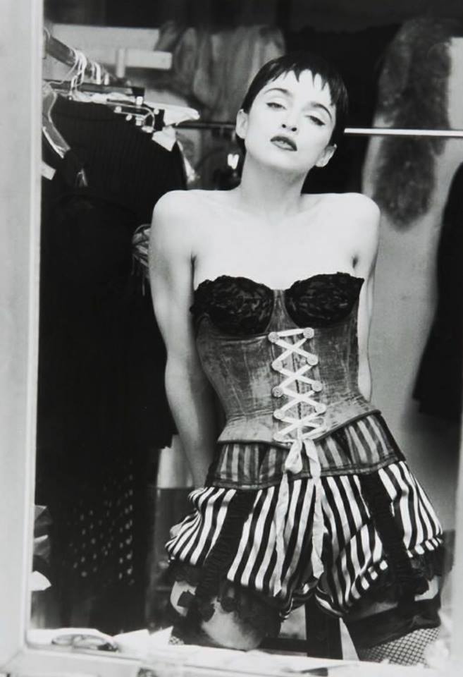 - Body corset vintage original de 1950 de nylon elástico negro con ribete de encaje festoneado en las copas, panel transparente, pinzas para liga y cierre frontal modelo «Jezebel» por «Renée Hollywood». Madonna se quedó con esta prenda la cual volvería a ser usada para el videoclip «Vogue» y para una salida personal.