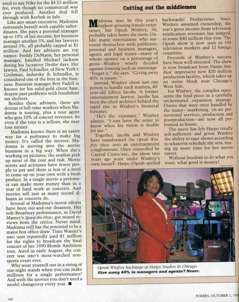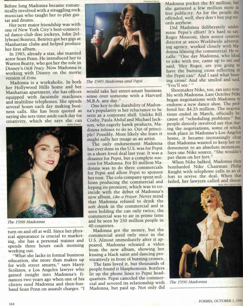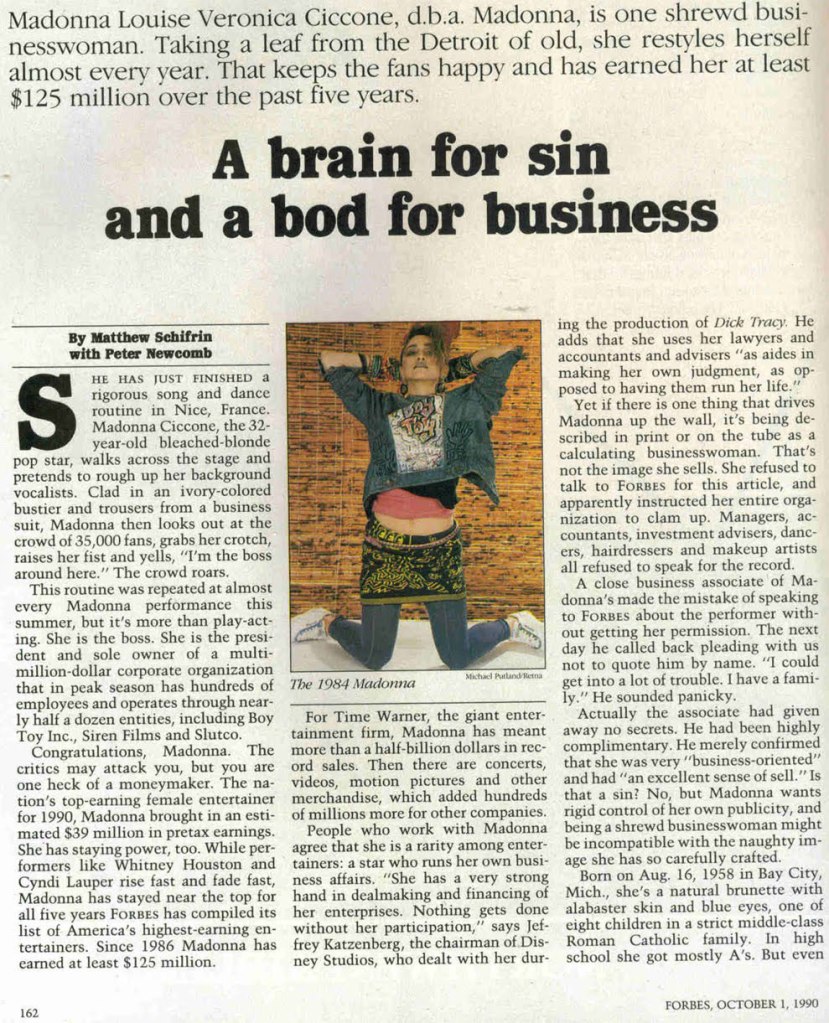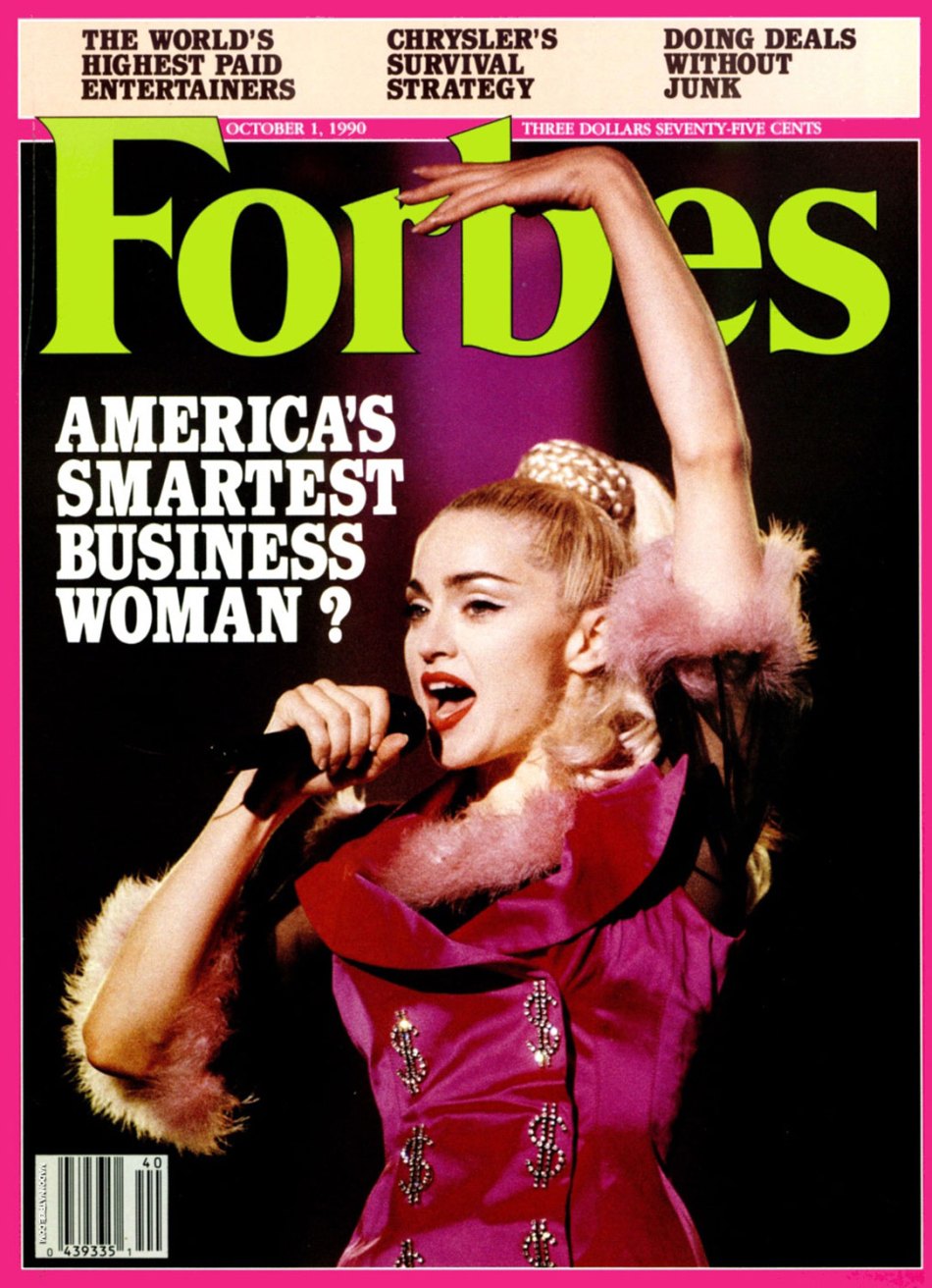 El 01 de octubre de 1990, Madonna aparece por primera y única vez en la tapa de la revista americana «Forbes». En la portada se mostraba una imagen de Madonna durante su «The Blond Ambition Tour» mientras interpretaba la canción «Material Girl» con un saco con el signo «$», con el título: «¿La mujer de negocios más inteligente de América?». La nota de cuatro páginas se titulaba: «Un cerebro para el pecado y un cuerpo para los negocios» estaba escrita por Matthew Schifrin y Peter Newcomb e incluía varias fotografías de Madonna de años previos.
