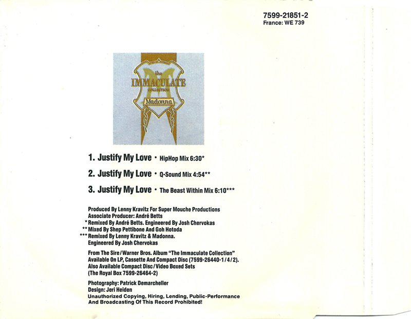 - “Justify my Love” es el primer single para promocionar el primer disco recopilatorio de grandes éxitos de Madonna, “The Immaculate Collection”, lanzado el 30 de octubre de 1990.