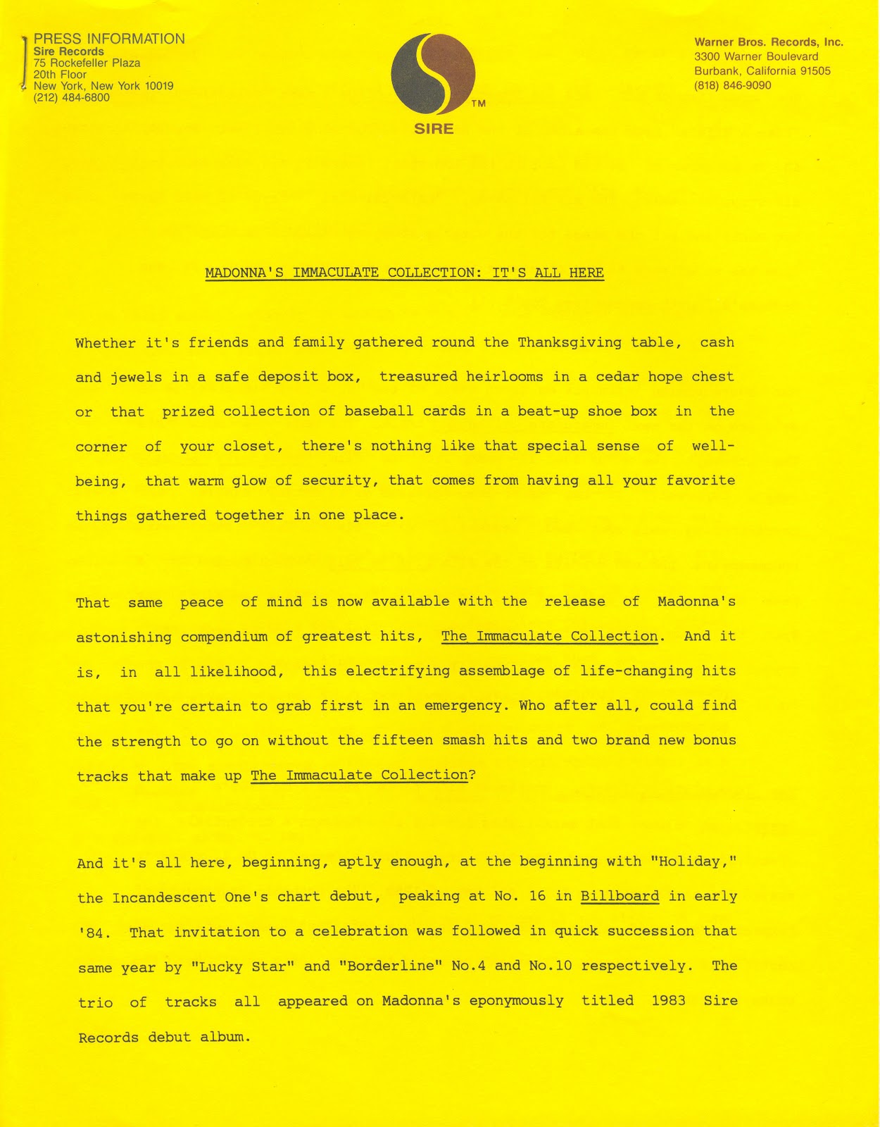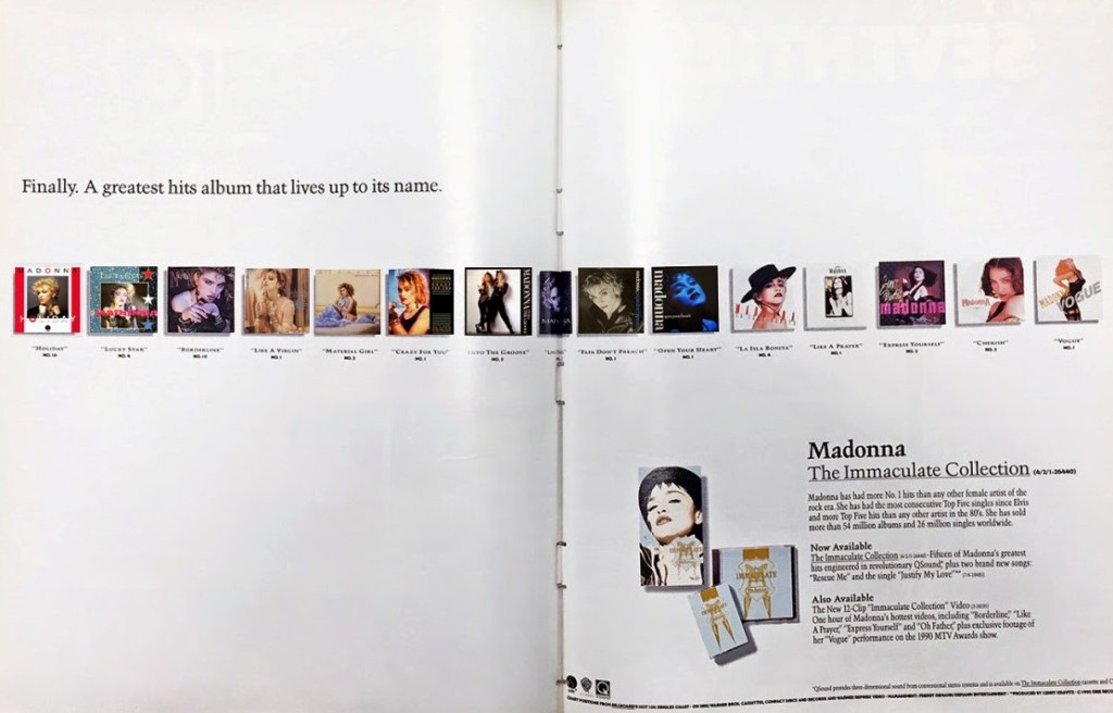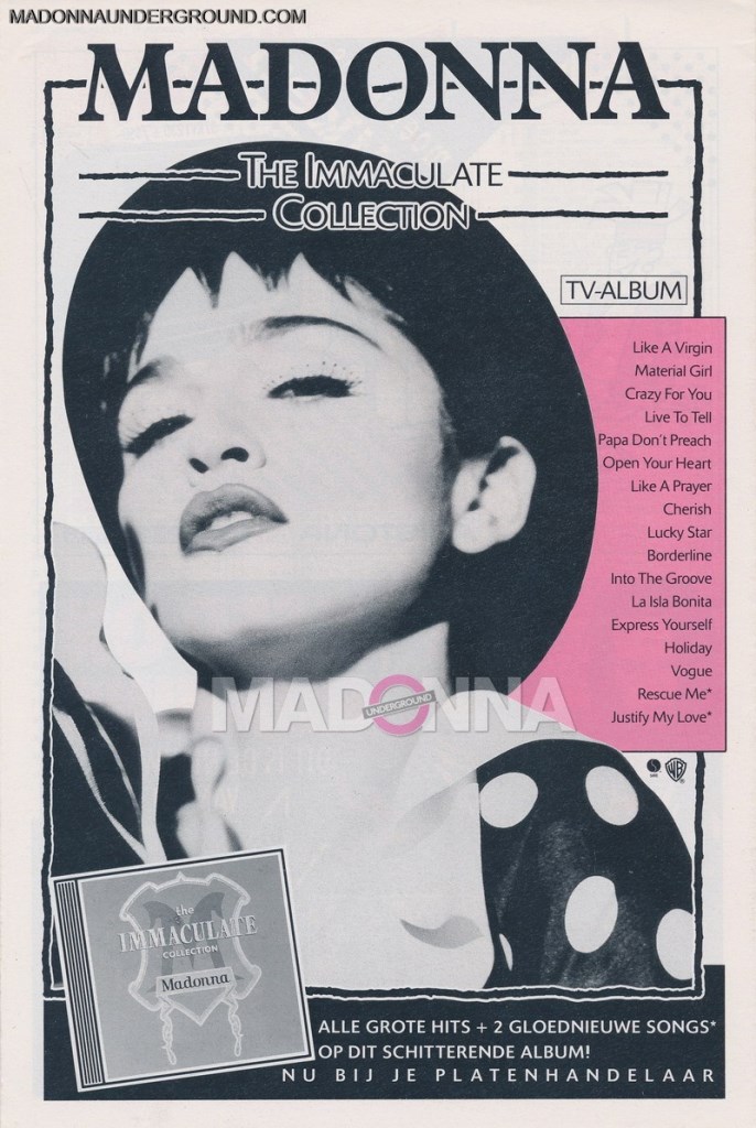 - “The Immaculate Collection” fue el primer disco recopilatorio de Madonna, sin contar “You Can Dance” que fue un disco de remixes. Este LP se lanzó el 9 de noviembre de 1990 por Sire Records y se convirtió en el disco más vendido de la carrera de Madonna.
