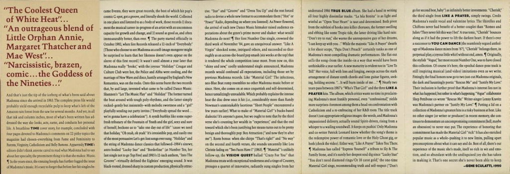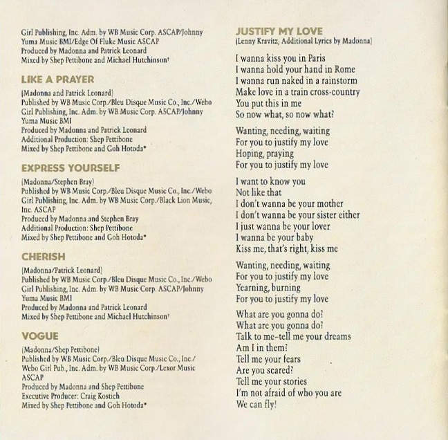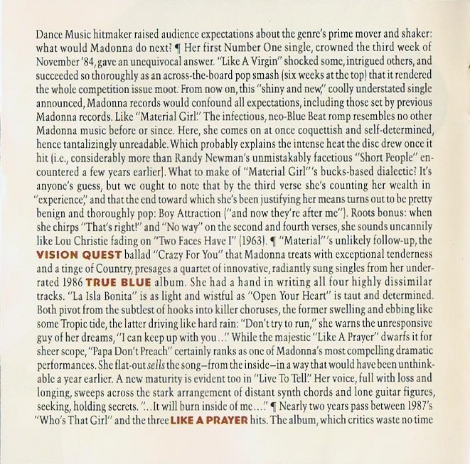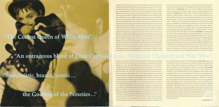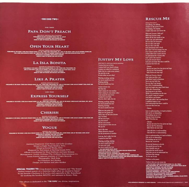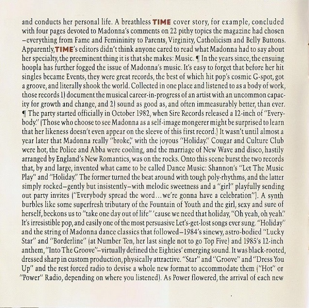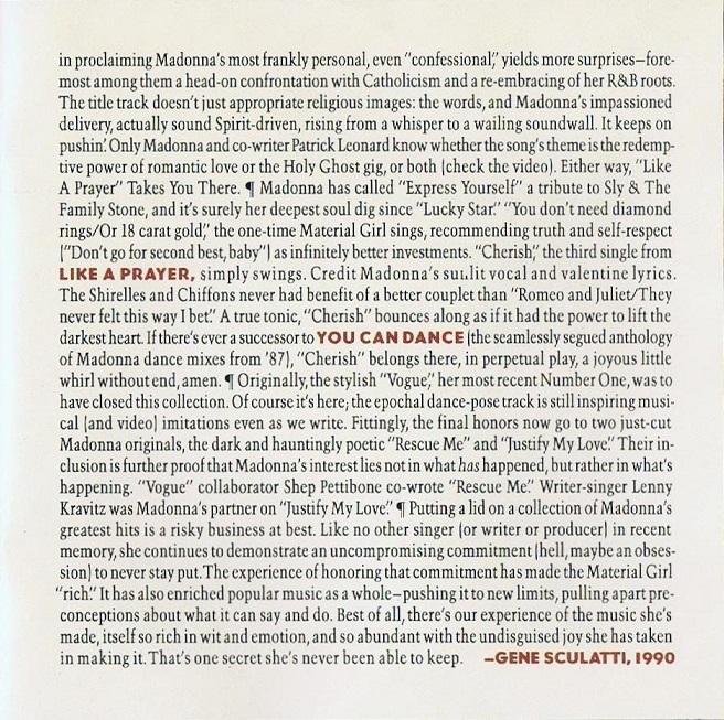 El CD incluía un booklet o librillo de 20 páginas en donde se agregaban más fotografias de la sesión de Herb Ritts, además un ensayo y un review del disco a cargo del periodista Gene Sculatti, los créditos de las canciones y las letras de los dos temas nuevos «Justify My Love» y «Rescue Me».