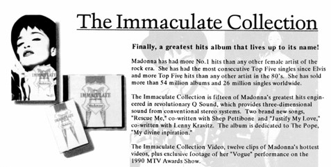 - “The Immaculate Collection” fue uno de los discos del año y más tarde se convirtió en el disco de la década vendiendo más que cualquier otro. Se convirtió una verdadera obra retrospectiva de la primera década de carrera de Madonna. La revista “Blender” lo puso en el N°01 dentro de los “100 Mejores Discos Americanos de Todos los Tiempos” y en el 2012 la revista “Rolling Stone” lo posicionó en el puesto N°184 dentro de los “500 Mejores Discos de Todos los Tiempos”.