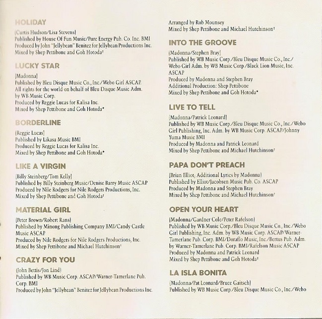 - AUTORES: Madonna / Reggie Lucas / Curtis Hudson / Lisa Stevens / Billy Steinberg / Tom Kelly / Peter Brown / Robert Rans / John Bettis / Jon Lind / Brian Elliot / Gardner Cole / Peter Rafelson / Bruce Gaitsch /