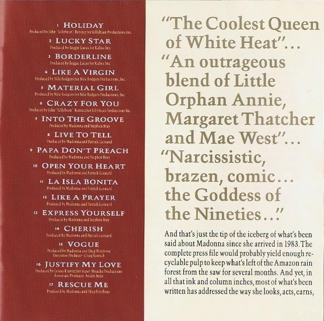 - El álbum consiste en una colección de 15 canciones, de las cuales 13 son los más grandes éxitos de Madonna desde 1983 hasta 1990, además se compusieron dos canciones nuevas que se editaron como sencillos: “Justify My Love” y “Rescue Me”.