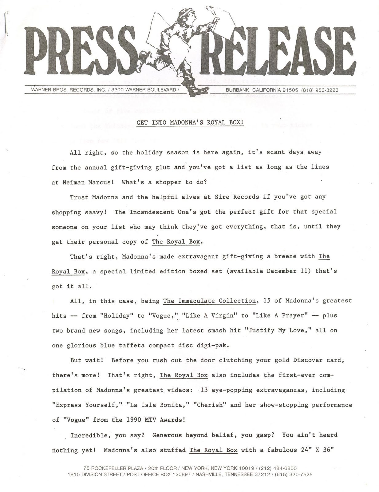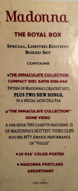 El 13 de diciembre de 1990 se lanzó una caja especial que acompañaba al lanzamiento del disco y del video «The Immaculate Collection». Se trata del box set «The Royal Box» y es, hasta ahora, uno de los items más deseados y admirados de todo el catálogo de Madonna. Se editó en USA y UK y se lanzó en dos versiones una con CD y otra con casette. «The Royal Box» incluye: