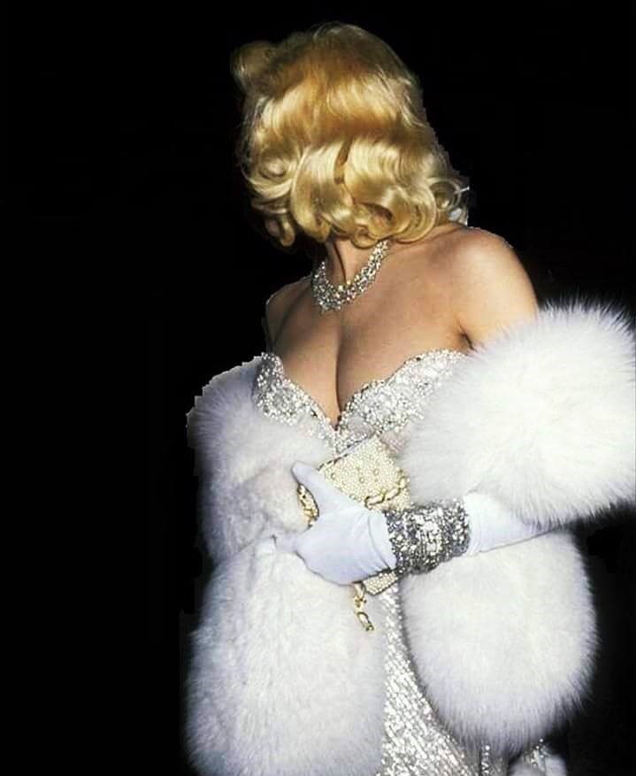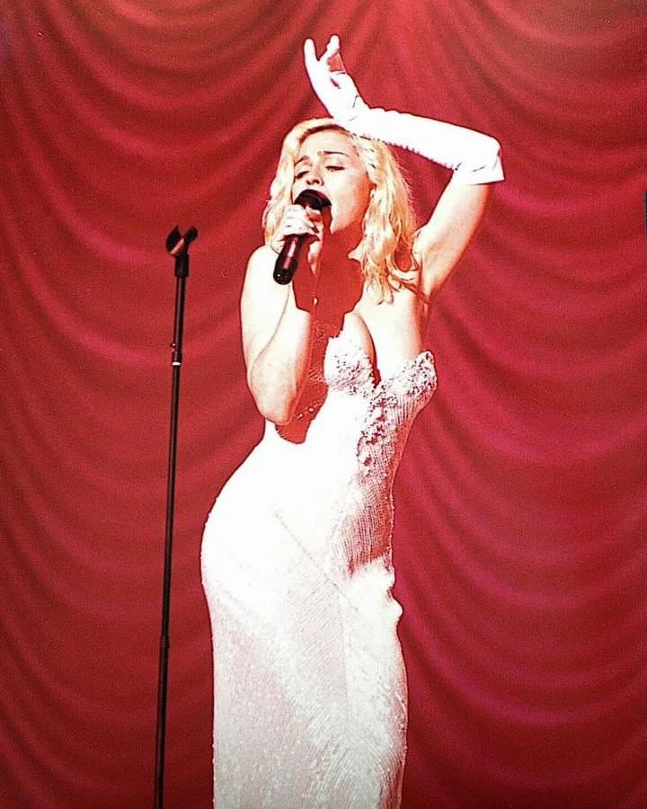 Para esta ocación, Madonna lució un exclusivo vestido diseñado a medida por Bob Mackie. Conoce más de la historia de esta legendaria pieza de vestuario en el artículo especial «El Vestido Millonario».