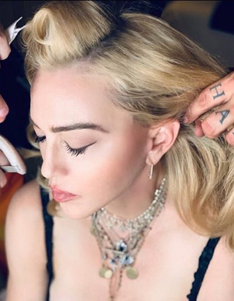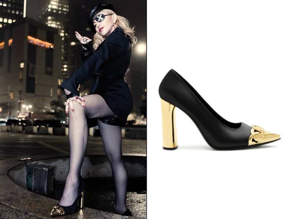 Para esta sesión, Madonna usó varios atuendos de diferente marcas. La podemos ver inicialmente con un blazer negro cruzado con cinturón hebilla dorada de la colección otoño-invierno de Versace; acompañó este look con unos zapatos de cuero negro con puntera y taco dorado pulido modelo «Agyness Luxe» de Casadei.