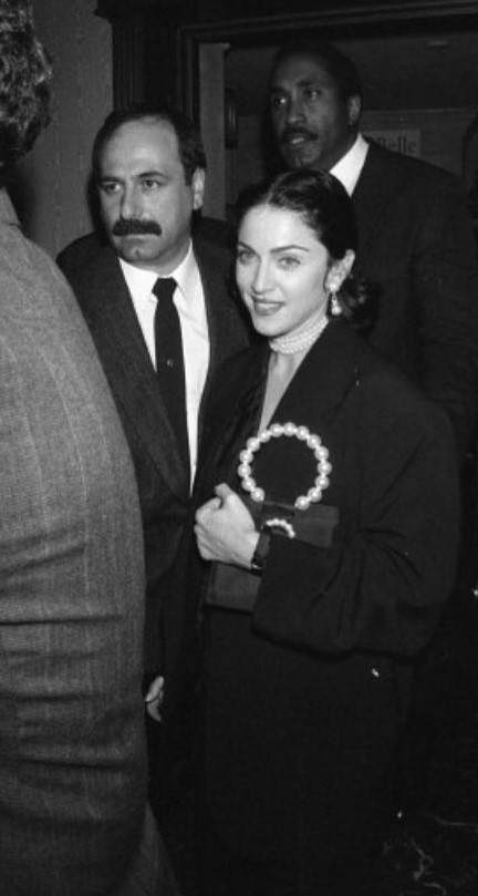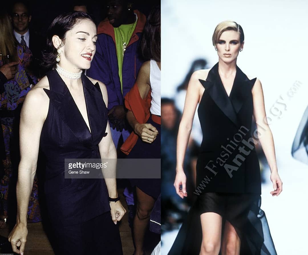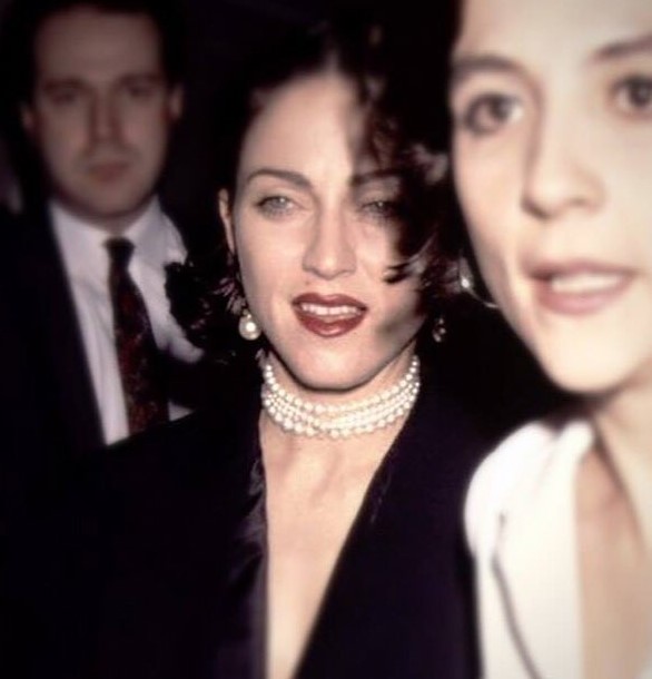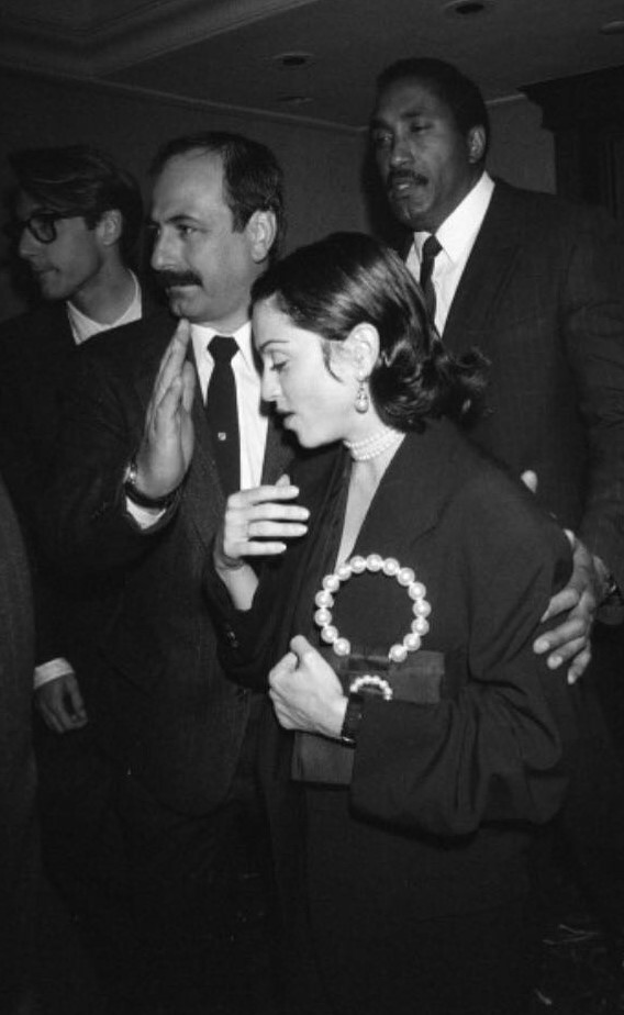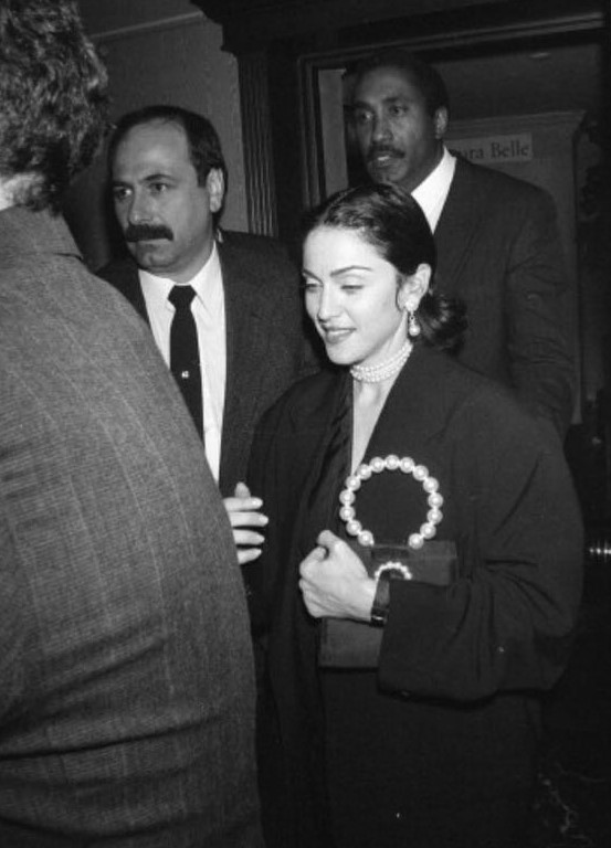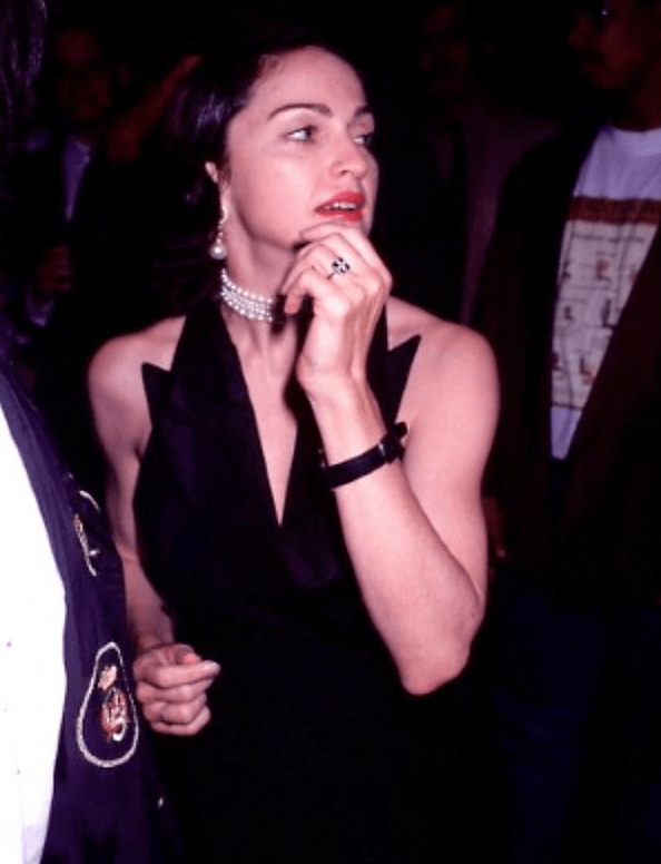 Para la fiesta, Madonna lució un chaleco negro con solapas smoking de seda de la colección primavera-verano 1991 de Christian Dior acompañado de collar y aretes de perlas y bolso de satén negro con manija de perlas marca Chanel.