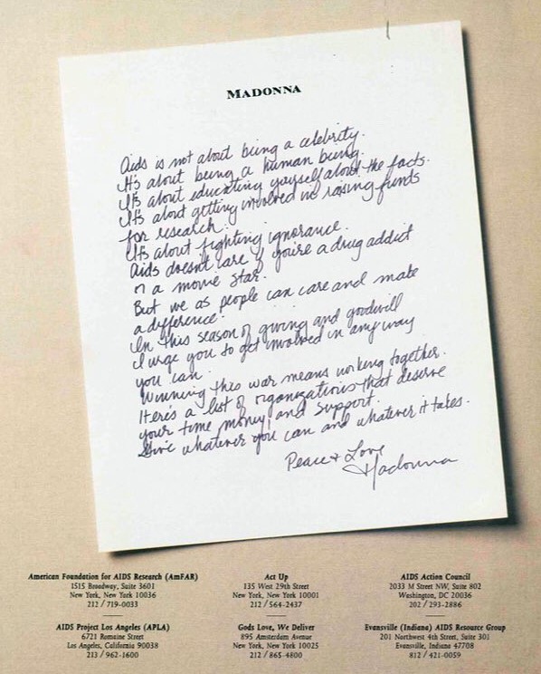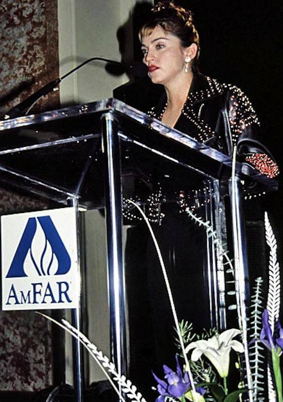 Para esos días, los rumores de que Madonna había contraído la enfermedad comenzaron a circular fuertemente y en esto se basó el discurso de la cantante: «Cuando surgieron los rumores de que yo era seropositivo, pensé, bueno, alguien se aburre realmente hoy. . . Vamos a inventar una verdadera historia jugosa. Traté de ignorarlo, pero continuaban. . . En lugar de apuntar con el dedo a las personas y hacer una cacerías de brujas y condenar mutuamente por estilos de vida y preferencias sexuales, todos debemos unirnos para combatir esta enfermedad. . . pero no lo hacemos. Porque tenemos miedo. Estamos asustados de nuestras pieles para afrontar la verdad de que el SIDA no es una enfermedad gay, es una enfermedad humana… Ahora no soy VIH positiva, pero ¿y si lo fuera? Tendría más miedo de cómo la sociedad me trataría por tener la enfermedad que la propia enfermedad. Si esto es por lo que tengo que pasar con mi participación en la lucha contra esta epidemia, entonces que así sea…No tengo miedo de estar asociada con personas con VIH positivas, y no tengo miedo de amar a las personas que son VIH positivas. Porque su calvario es más importante que el mío, porque su coraje es más grande que el mío, porque por lo que están pasando es real. Y si podemos aprender a lidiar con lo real, y nuestros miedos, entonces tengo la esperanza de que podamos vencer esta enfermedad «.