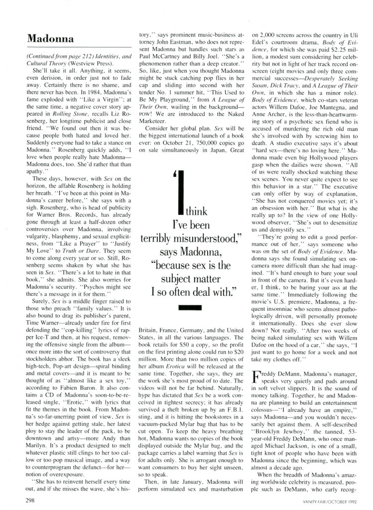 En octubre de 1992, Madonna aparece en la tapa de la edición americana de «Vanity Fair» fotografiada por Steven Meisel. La tapa se titula «Hot Madonna» y la nota exclusiva realizada por Maureen Orth y se donomina «Madonna in Wonderland» abarcaba casi 15 páginas de la revista y se centraba fundamentalmente en el próximo lanzamiento de su libro «Sex». Puedes verla aqui!. Madonna además realizó un portfolio especial con una temática bastante polémica (vestida como un niña) que incluía vestuario de Anna Sui y accesorios de Cherie.
