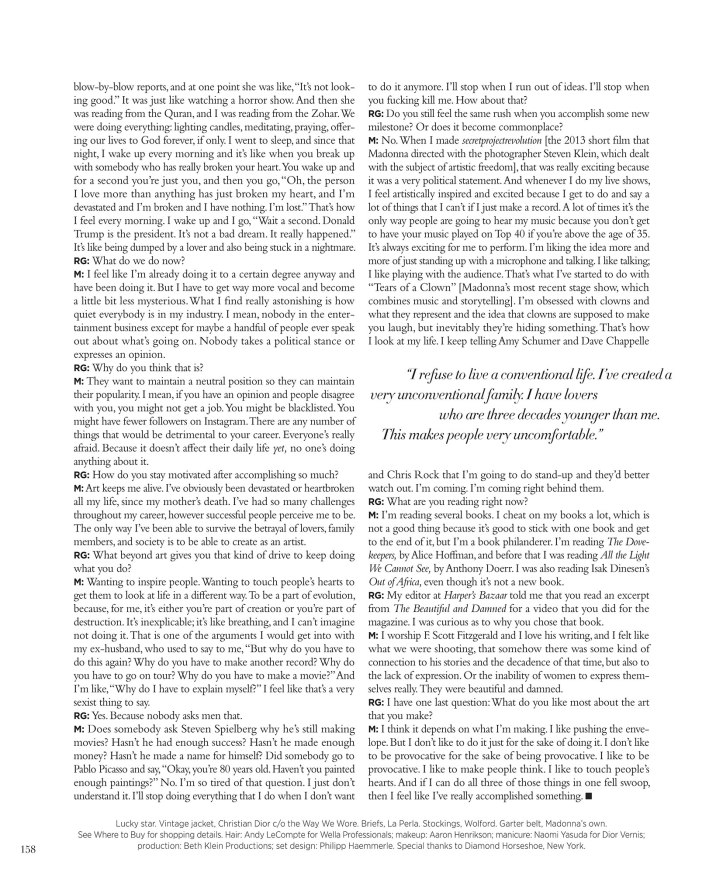 A principios de enero de 2017, Madonna anunció en sus redes sociales que estaría participando de la edición 150° aniversario de la revista «Harper’s Bazaar» a nivel mundial. La noticia se supo el 08 de enero y también se confirmó que la cantante estaba trabajando en un portfolio especial conel dúo de fotógrafos Luigi Murenu y Iango Henzi también conocidos como Luigi & Iango. Efectivamente, el 17 de enero de 2017, todas las tiendas de USA mostraron la nueva edición de la revista con un impactante primer plano del rostro de Madonna. El título de tapa decía «Madonna: mito vs. realidad». La nota escrita por Roxane Gay constaba de 14 páginas en las que la gran mayoría eran fotografías. La revista salió en algunos países con doble portada (la edición regular y la edición de suscriptores) y fue re lanzada a lo largo del año en diferentes países.