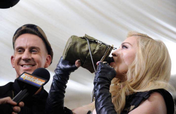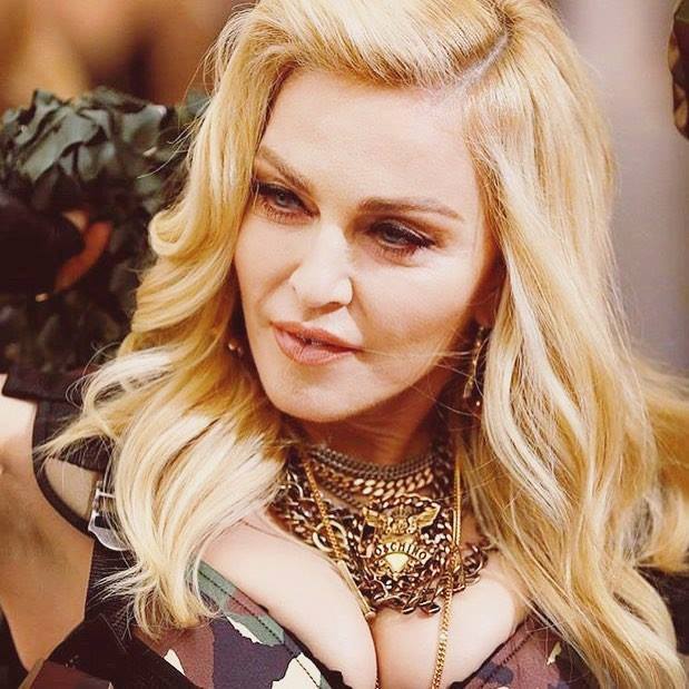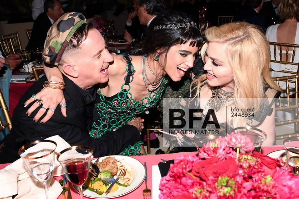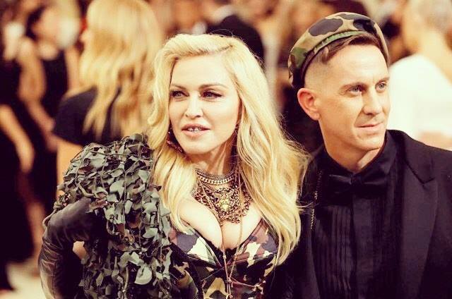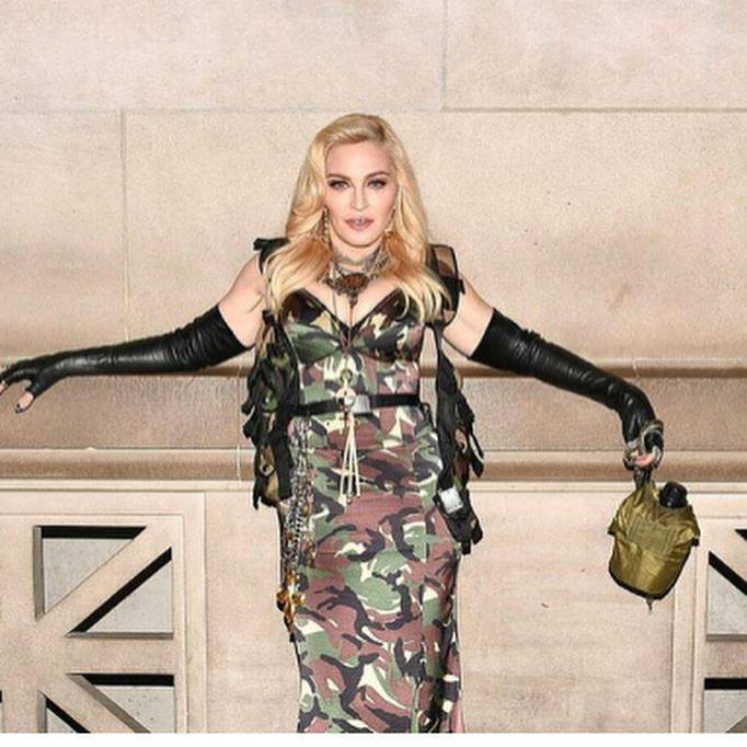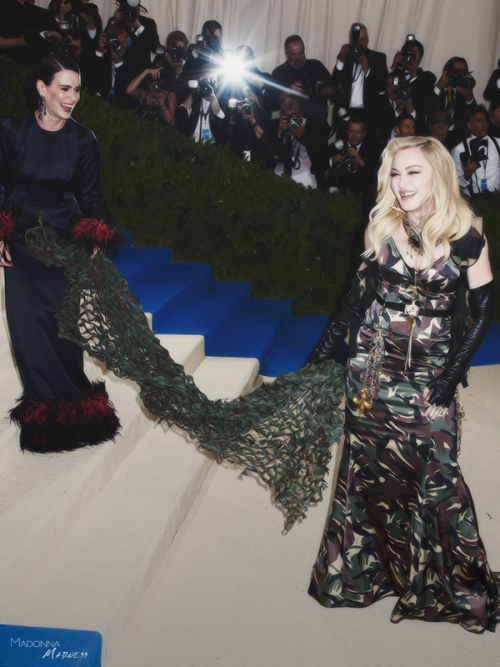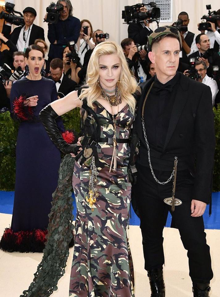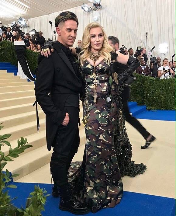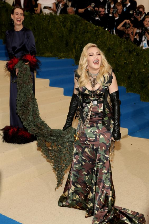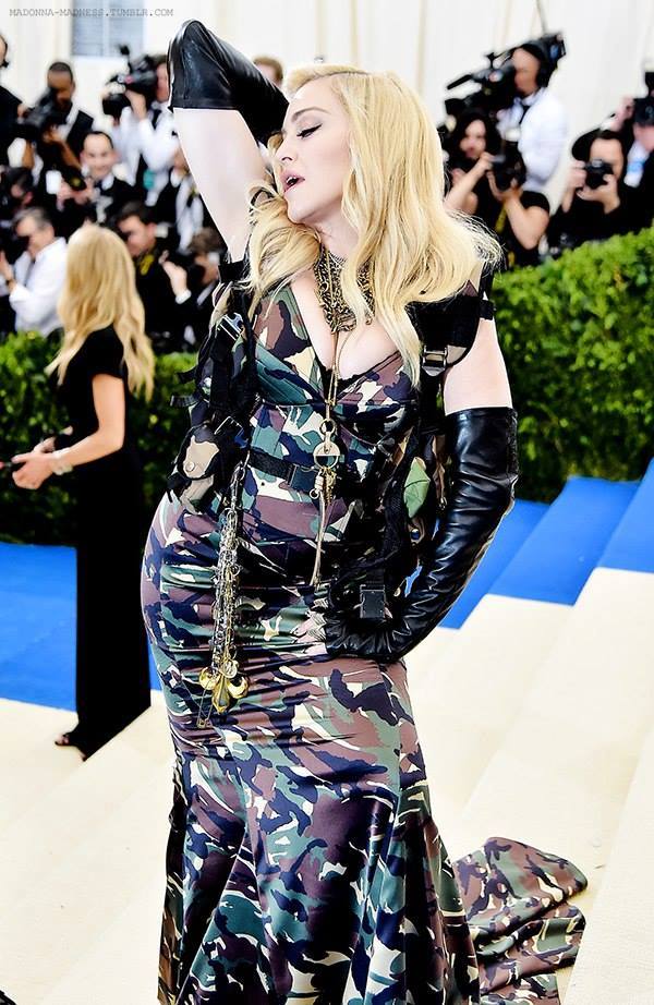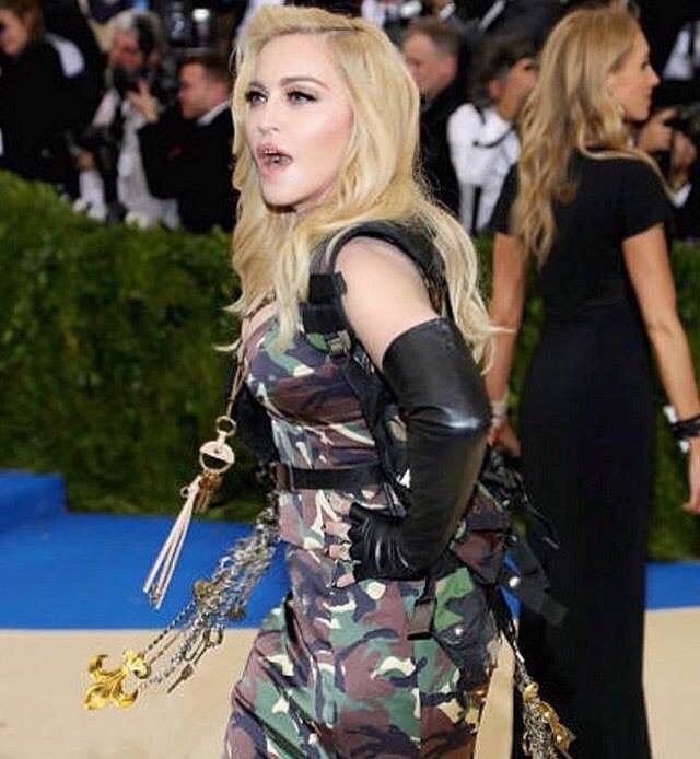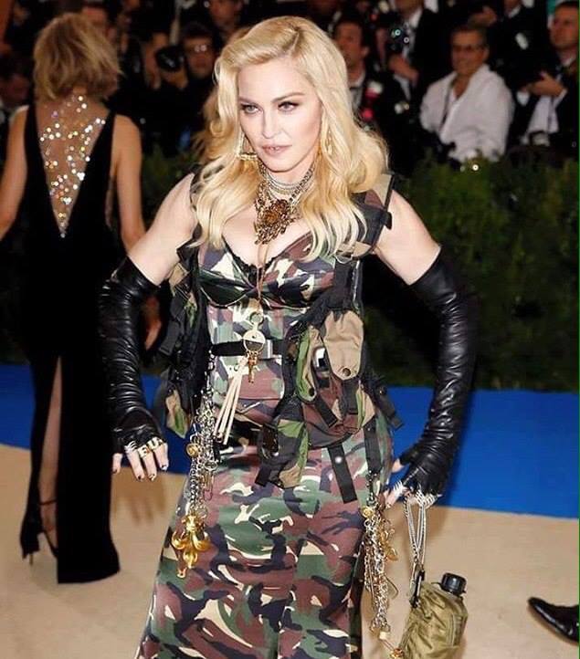 A pesar de que la temática era inspirada en la diseñadora Kawakubo, muchos de los invitados no siguieron la premisa al pie de la letra. Tal es el caso de Madonna. La cantante lució un ajustadísimo vestido con estampado de camuflaje y accesorios típicos del uniforme militar como tiradores, correas, bolsillos y cadenas. El atuendo se compone de un muy escotado corset, falda larga con una pequeña cola, guantes largos negros y una gran pieza de red entretejida militar que actúa a modo de boa o chal. Además de las múltiples joyas y collares, Madonna lució su parrilla grillz de oro en los dientes (tan odiada como amada) y hasta una cantimplora que, según ella, contenía su bebida favorita, champagne rosé. El artífice de todo el look de la reina del pop fue Jeremy Scott, el famoso diseñador de la marca Moschino. Madonna comentó que ideó el vestido junto a Scott: «sabíamos que queríamos camuflage desde el comienzo. Como un estilo Barbie de combate».