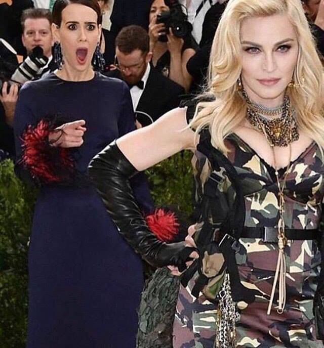 Un momento divertido se vivió también en la alfombra roja, cuando la actriz Sarah Paulson se mostró estupefacta al compartir la pasarela al mismo momento que Madonna. Su expresión quedó plasmada para siempre. Paulson se encontraba posando para los cientos de fotógrafos cuando de repente comenzó a sentir un gran revuelo detrás suyo. Al darse vuelta se encontró nada menos que con Madonna quien hacía lo suyo del otro lado dándole la espalda. Paulson quedó impactada ante la presencia de Madonna y la señaló sin pudor con la boca abierta demostrando su sorpresa. Para no ser menos, la actriz se decidió a tomar la red de camuflaje, accesorio que Madonna llevada con su atuendo para atraer su atención. Las dos jugaron unos segundos de manera alegre y descontracturada. Madonna pareció disfrutar de la pequeña broma de Paulson.