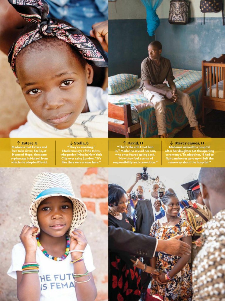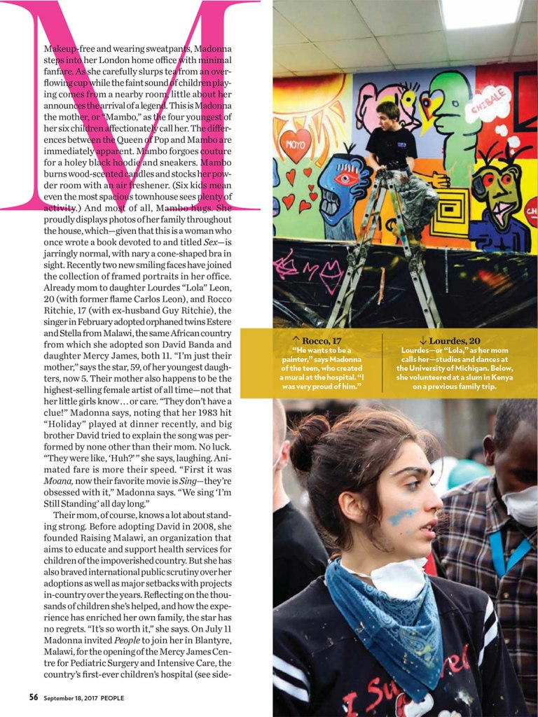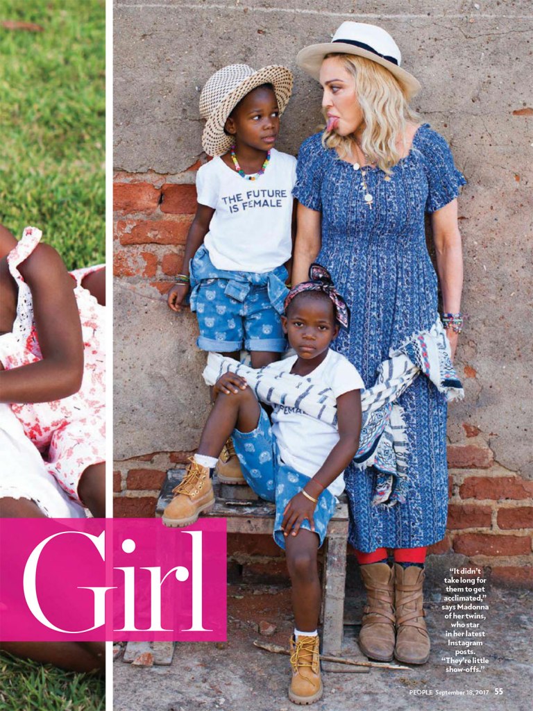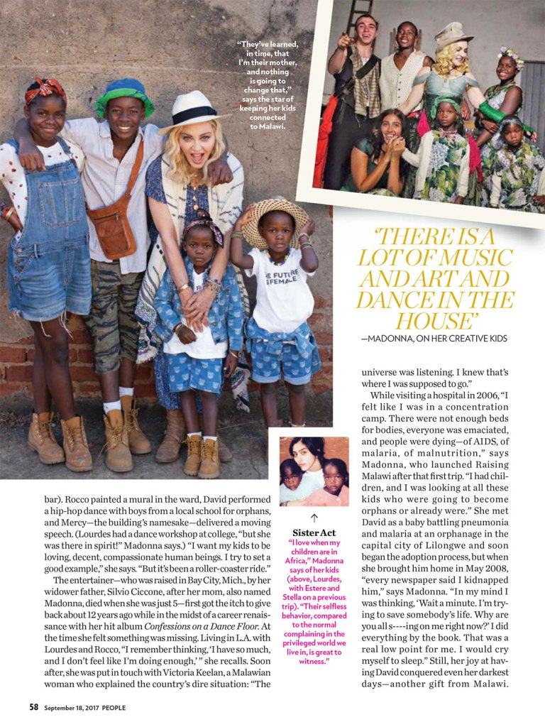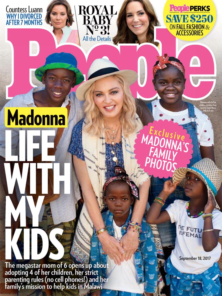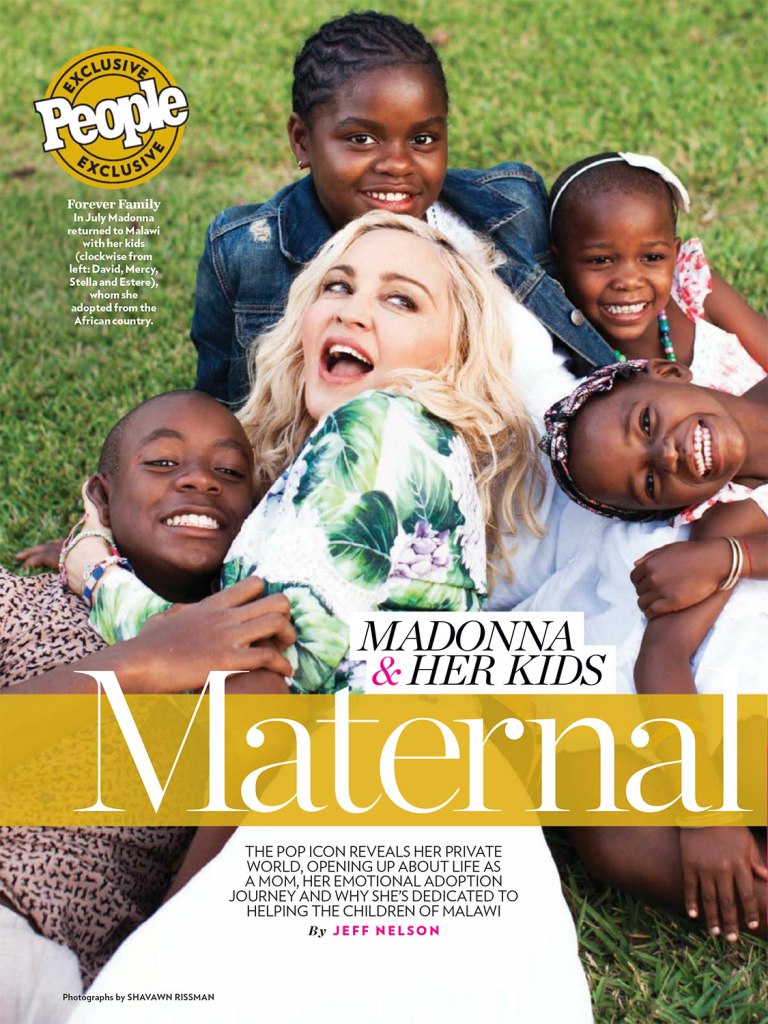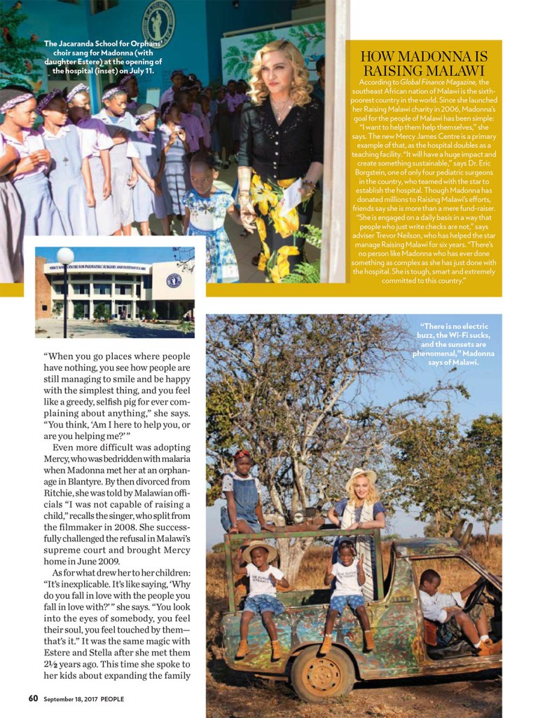 El 18 de septiembre de 2017, Madonna aparece en la tapa de revista «People» con un especial sobre su trabajo solidario en Malawi y su nueva familia, ahora más numerosa, gracias a la adopción de las gemelas Ester y Stella en febrero de ese año. El título en la tapa dice: «La vida con mis hijos» y más abajo: «la megaestrella, madre de seis, nos habla sobre la adopción de sus cuatro hijos, sus estrictas reglas parentales (no celulares) y la misión de su familia para ayudar a los niños en Malawi». La nota por Jeff Nelson, se titulada «Maternal Girl» y durante siete páginas se refiere a la intimidad de la nueva familia de Madonna y a su incansable trabajo solidario con el país africano. La entrevista es una exclusiva de «People» cuyo fotógrafo viajó especialmente para acompañar a Madonna y tomar fotografías únicas de su viaje a Malawi en el mes de julio. En esta edición, también apareció uno de los primeros anuncios gráficos de la línea «MDNA Skin», antes de su lanzamiento en USA.