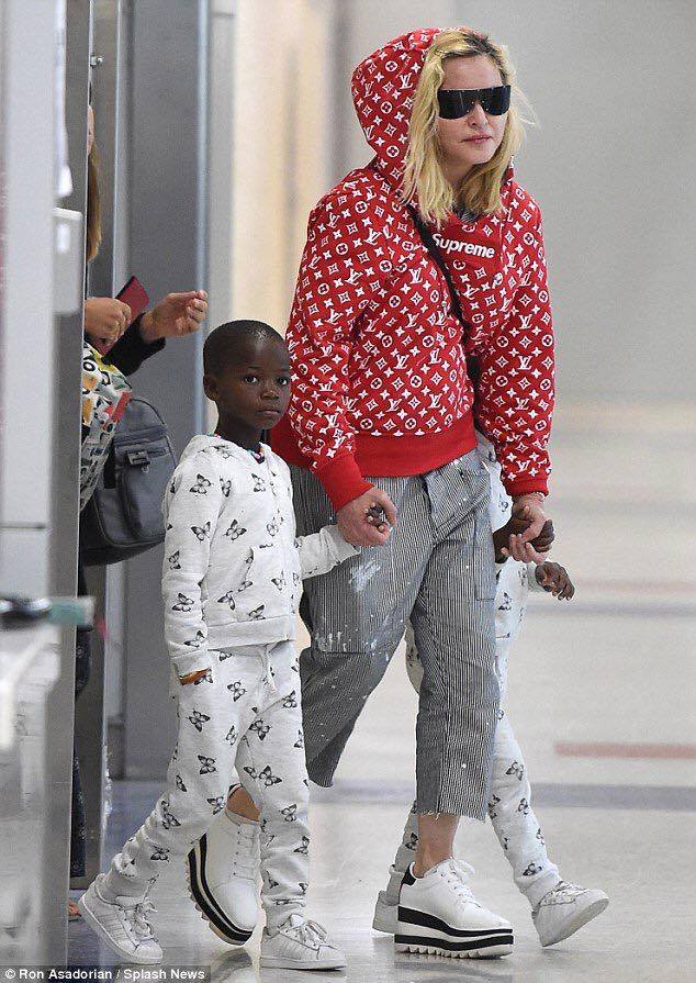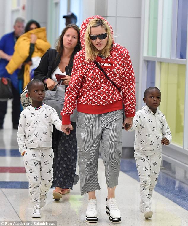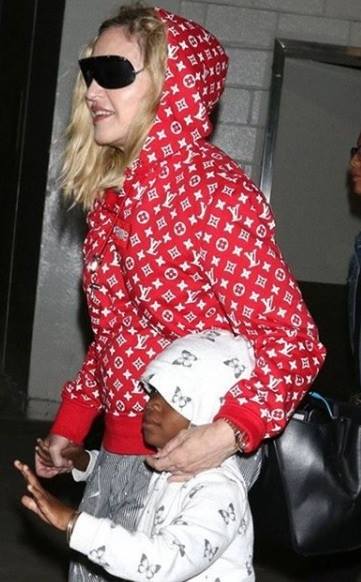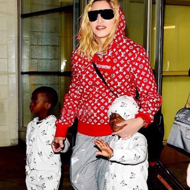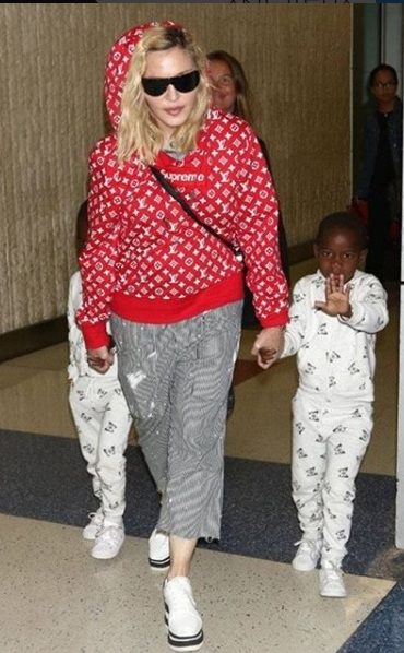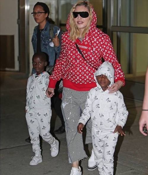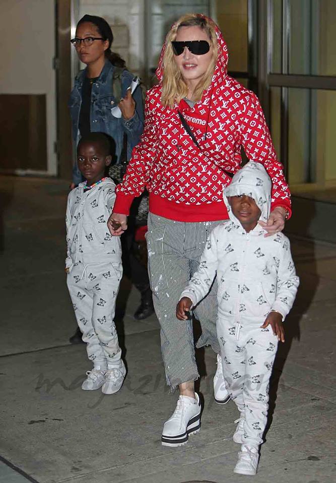 El 21 de agosto de 2017, Madonna fue captada por paparazzis en el aeropuerto «JFK» de la ciudad de New York al llegar de su viaje por Italia luego de festejar su cumpleaños n°59. Se la vio llegar de la mano de sus gemelas Ester y Stella, su otra hija, Mercy James también venía en el grupo. Madonna lucía pantalones capri rayados, su abrigo deportivo «Supreme» por Louis Vuitton y unas zapatillas blancas con plataformas de la última colección de Stella McCartney.
