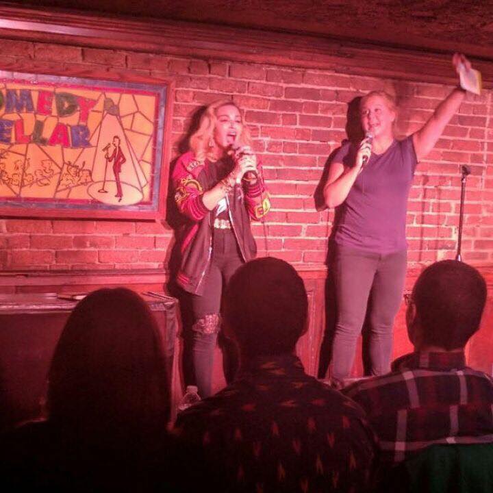 Luego de su presentación en el show «The Late Night» con Jimmy Fallon, la noche del 26 de septiembre de 2017, Madonna decidió hacer algo que había hecho muy pocas veces. Esa misma noche, la cantante, acompañada de su manager Guy Oseary y su amigo el fotógrafo francés JR, debutó como comediante de stand-up en el conocido club «The Comedy Cellar». El club es conocido por ser el sitio de presentación de los artistas y comediantes de stand-up más famosos. Tal es el caso de Amy Shumer, amiga de Madonna y probablemente su nexo de concexión con con el club. Esta no sería la primera vez que Madonna hiciera stand-up; ya se había probando antes en el mismo programa de Jimmy Fallon en 2015 y también había realizado algunos monólogos durante sus shows «Tears of a Clown» en 2016. Pero esta vez, fue un poco más allá y decidió sumar más logros a su polifacética carrera y subir a uno de los escenarios más representativos del rubro. Madonna lució los mismos pantalones de «Mother» denim que usó para el programa de televisión, acompañado de una camiseta negra y una chaqueta de cuero con apliques; las gafas «Moschino» no podían faltar. En su cuenta de Instagram Madonna comentó: «Y al minuto siguiente estaba junto a Amy Schumer en el NY Comedy Cellar haciendo mi debut en stand-up. Qué emoción. Gracias Amy!»
