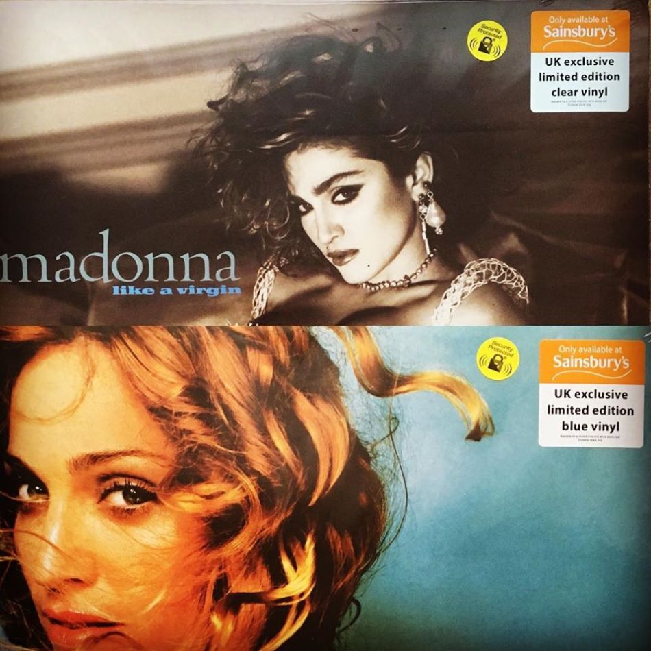 El 13 de octubre de 2017, la cadena de tiendas de UK, «Sainsbury’s» decidió lanzar de manera exclusiva dos ediciones de antiguos discos del catálogo de Madonna. Hablamos del LP «Like a Virgin» lanzado originariamente en 1984 y «Ray of Light» editado en 1998. En esta oportunidad, las tiendas pusieron en venta una cantidad limitada de estas re-ediciones con la particularidad de que los vinilos eran coloreados; transparente en el primer caso y azul en el segundo. Esto los convirtió inmediatamente en ítems de colección y artículos obligados para cualquier fan. Cabe destacar que no había ningún cambio ni en el diseño ni el track list de los discos; «Like a Virgin» se re-editó en su versión original de 9 temas sin «Into the Groove». En la tapa se adjuntaba un sticker informativo. Estos mismos discos se re-lanzaron en diciembre de 2017 para Francia en las tiendas Fnac; Italia en Discoteca Laziale y Australia en JBHiFi Store. Esta no es la primera vez que «Sainsbury’s» re-lanza discos de Madonna, ya que en 2016, se habían editado, también de manera limitada, los discos «True Blue» (1986) y «Like a Prayer» (1989).