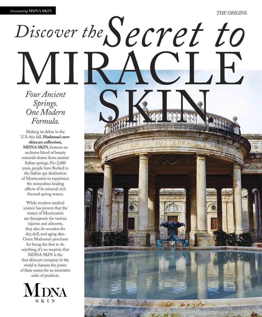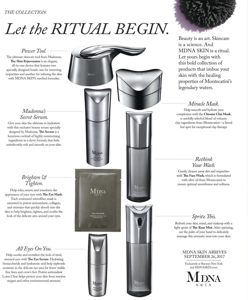 Entre octubre y noviembre de 2017, la promoción de la línea de productos «MDNA Skin» luego de desembarco en USA siguió de manera intensa, tanto en la prensa como en redes sociales. En octubre se lanzaron dos campañas publicitarias; la primera a principios de octubre, con un comercial realizado por el dúo de fotógrafos Luigo & Iango. El comercial de 1 minuto de duración muestra a Madonna luciendo diferentes atuendos, gorra de cuero, capucha, etc., mientras se acompaña de la canción «Let it Will Be» (2005). De este comercial se tomaron una serie de fotografías que ilustrarían más tarde toda la campaña gráfica y de prensa. Una de las primeras publicaciones que presentó este set fue la edición de «Marie Claire» del 01 de octubre de 2017.