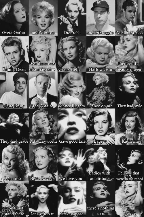 De esta manera, en unos pocos minutos se escribió el fragmento de canción que quizás fuera uno de los principales responsables de su éxito. El rap de «Vogue» dice: «Greta Garbo, and Monroe; Dietrich and DiMaggio; Marlon Brando, Jimmy Dean, On the cover of a magazine; Grace Kelly; Harlow, Jean, picture of a beauty queen. Gene Kelly, Fred Astaire, Ginger Rogers, dance on air. They had style, they had grace, Rita Hayworth gave good face. Lauren, Katherine, Lana too; Bette Davis, we love you. Ladies with an attitude. Fellows that were in the mood. Don’t just stand there, let’s get to it. Strike a pose, there’s nothing to it…Vogue«