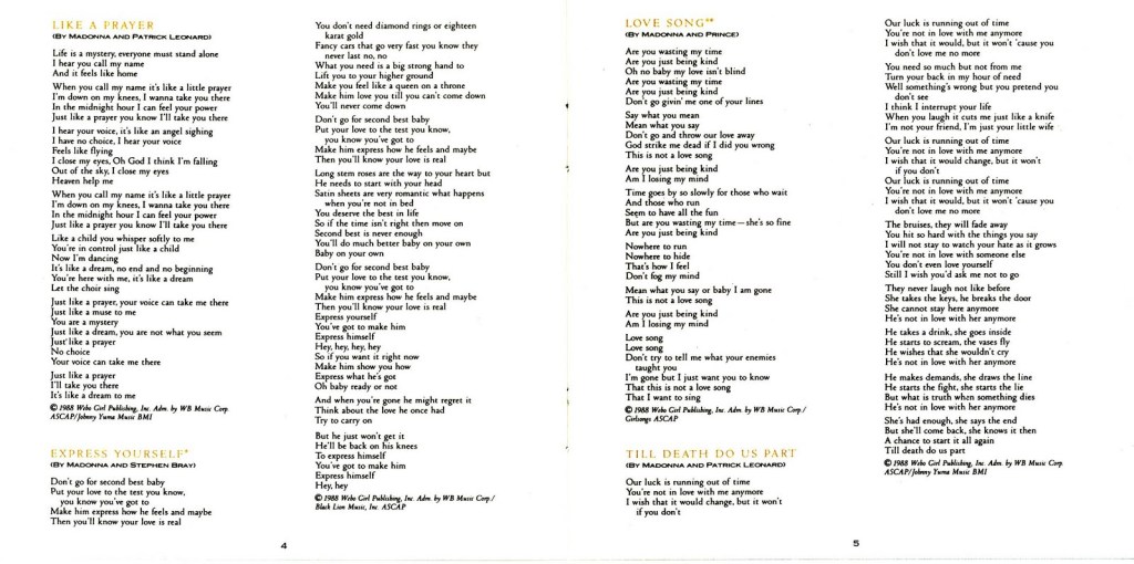 En el insert del disco de vinilo, encontramos otra foto ahora casi de cuerpo entero de la misma sesión con Madonna luciendo el mismo jeans de la tapa y una blusa violeta vaporosa, se destaca una cruz de rubíes en su cuello. De un lado del sobre vemos la foto y los créditos del disco, mientras que de el otro lado podemos encontrar las letras de las canciones. Este mismo diseño fue luego utilizado para la contratapa de la edición en CD.