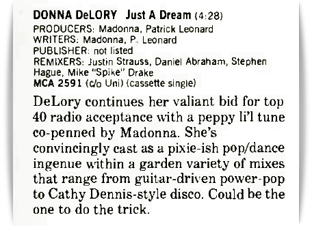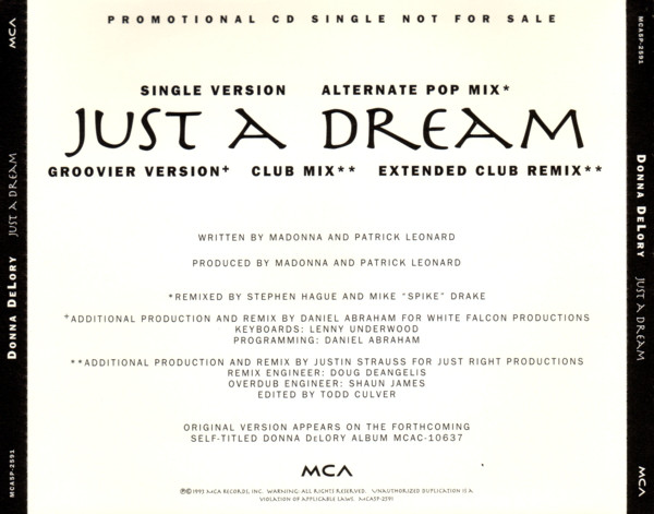Esta canción fue el segundo single del disco solista de Donna De Lory lanzado el 9 de Marzo de 1993. Cuando De Lory estaba preparando el material para su álbum debut, Madonna le cede una canción de su autoría. «Just a Dream» es un tema compuesto y producido por Madonna y Patrick Leonard en 1988 para formar parte del disco «Like a Prayer», cuando se estaba finalizando el proceso de grabación, Madonna decidió que la canción no encajaba demasiado con todo el contexto del álbum y quedó descartada. En 1992, la cantante le recomienda a De Lory, quien fuera su corista desde hacía más de cinco años, que se contactara con Leonard para re grabar su propia versión del tema. Donna De Lory grabó nuevamente la canción y se decidió dejar la voz de Madonna para los coros y de esta forma, se invirtieron los roles. La versión original grabada sólo por Madonna para el disco «Like a Prayer» todavía permanece inédita. Fue así como «Just a Dream» apareció en el disco debut de De Lory lanzado por MCA Records a fines de 1992.