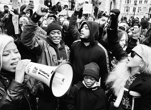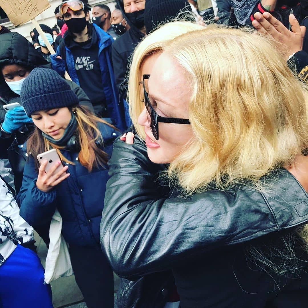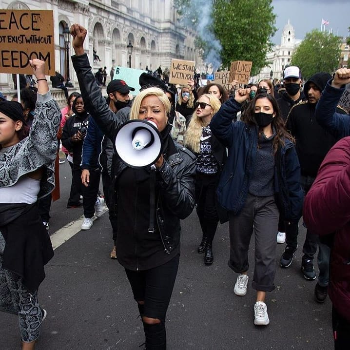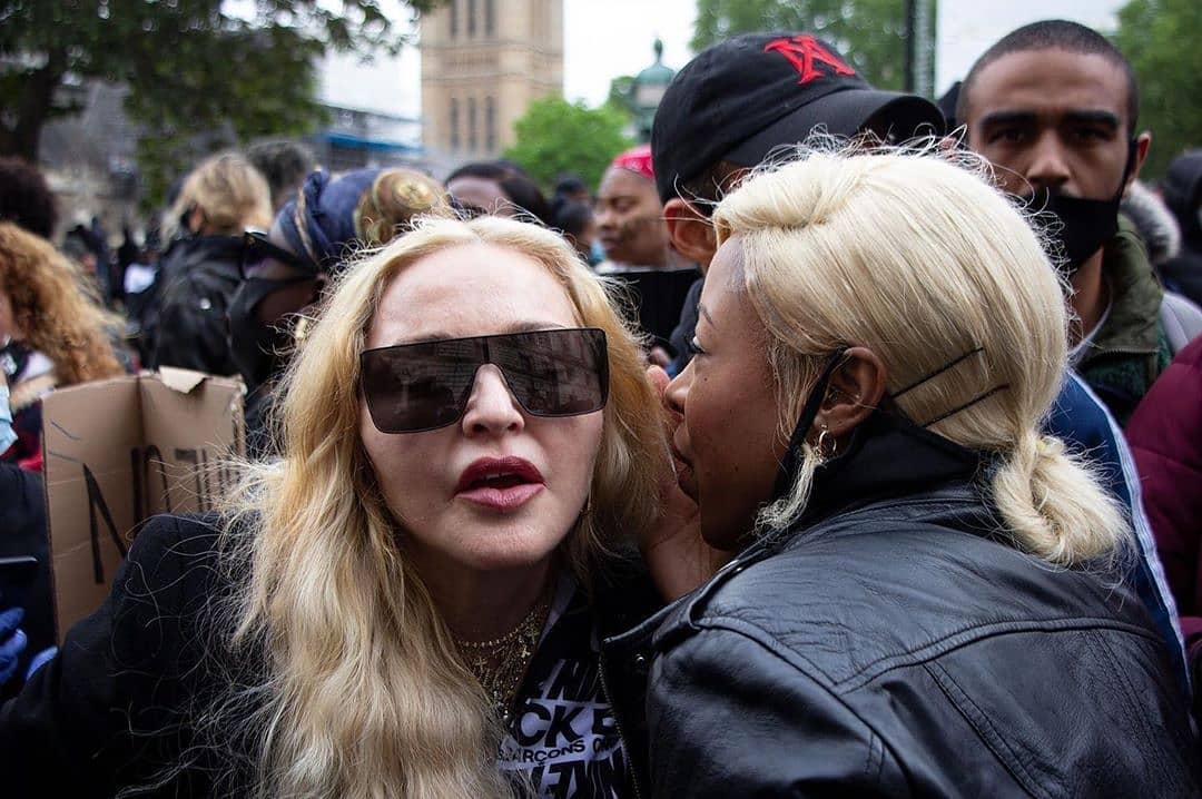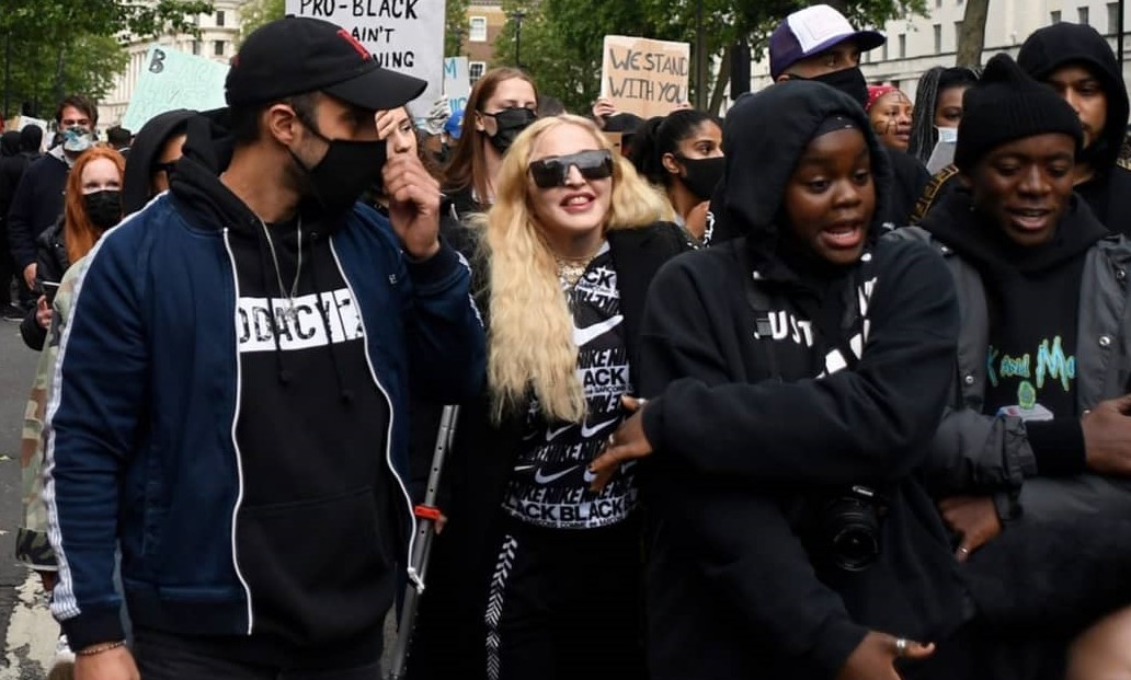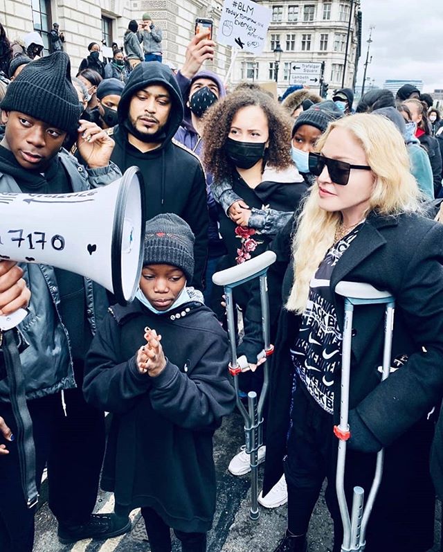A principios de Junio, se comenzó a gestar en Londres, una serie de marchas y protestas para levantar la voz en contra del racismo en Inglaterra y para sumarse al pedido de justicia por el asesinato de George Floyd en Estados Unidos. El sábado 06 de Junio de 2020, se organizó la marcha «Black Lives Matter» en Central London a la que concurrieron cientos de personas en una manifestación pacífica y sin conflictos. La mayoría de la gente quedó impactada, además por la presencia de Madonna, quien al estar pasando la cuarentena por la pandemia de coronavirus en la capital inglesa, decidió «hacer más que decir» y salió a las calles a marchar. La acompañaban un grupo de personas entre los cuales pudimos ver a sus cuatro hijos adoptivos: David Banda, Mercy James y las gemelas Estere y Stella. Al grito de «sin justicia sin paz», la estrella caminó por las calles de Londres rodeada de personas que apoyando la misma causa. Sus hijos mayores bailaron y cantaron con la multitud y hasta se atrevieron a tomar el megáfono y dar sus opiniones. Madonna se mostró alegre, relajada y animada con toda la gente, a pesar de haber caminado gran cantidad de calles con muletas (recordemos que se encuentra en rehabilitación por sus lesiones en rodillas y cadera). Luego, Madonna subió esta experiencia a sus redes sociales comentando: «Pacífica protesta con la familia en UK, marchamos desde el Parliamento por 10 calles. Fue un honor para todos nosotros estar allí. Importante para mis hijos saber que están aquó para presenciar un gran momento histórico; no sólo en América sino alrededor del mundo».