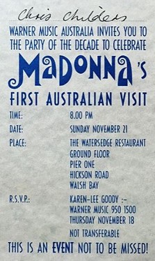 El sábado 21 de noviembre, la Warner Australia decide realizar una fiesta para honrar la primera visita de Madonna al país. El evento se llevó a cabo en el restorán «The Water Edge» en la bahía de Walsh. Madonna fue llevada en lancha desde su hotel hasta el evento, la cantante lució un pantalón rojo con cuero (ya visto en otras oportunidades), un corpiño de cuero, top transparente y chaleco también de cuero y todo en color negro. Se mostró contenta y posó subida a una tabla de surf junto a un grupo de integrantes del equipo oficial de Surf; firmó un gran banner que luego sería vendido en subasta para recaudar fondos para la lucha contra el SIDA y recibió de manos de su amigo el conductor de televisión Molly Meldrum el premio a la «Artista del Universo» por superar ventas de más de 2 millones de discos en Australia.