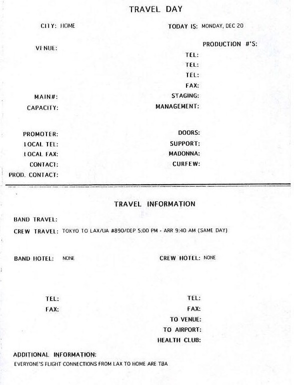 Luego de su último show en Sydney el 04 de diciembre, Madonna toma su jet privado para Japón donde finalizaría su gira. El resto del equipo viajó en aerolíneas comerciales. Dejando Sydney el 05 de diciembre a las 22:40 pm y llegando a Tokio a las 06:10 am y conectar con Japan Air hacia Fukuoka donde llegó finalmente a las 12:40 pm del 06 de diciembre. Durante su estadía en Fukuoka, Madonna y todo el equipo se hospedaron en el hotel «Nikko». Madonna realizó tres shows en la ciudad el 07, 08 y 09 en el Fukuoka Dome, estos shows fueron filmados y grabados de manera exclusiva y transmitidos más tarde por la televisión japonesa.