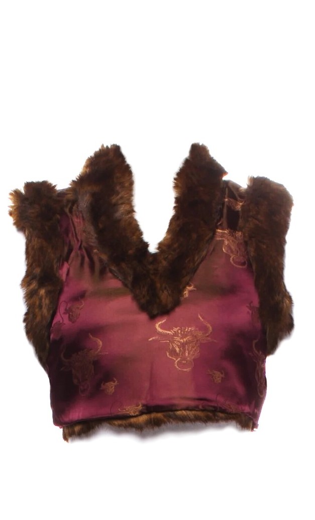 - Top de seda sin mangas en color violeta con estampado de cabeza de toro en dorado y ribete de piel sintética de la colección otoño-invierno 1994 de Jean-Paul Gaultier.