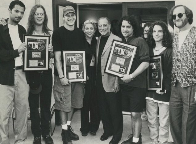 Madonna con Freddy DeMann y Guy Oseary en las oficinas de Maverick Records en New York, con el grupo «Candlebox» uno de los primeros éxitos de las discográfica antes de la llegada de Alanis Morisette y que había colaborado en el soundtrack del film «With Honors».