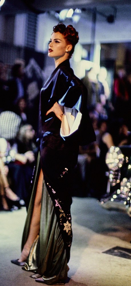 Bata de seda en color azul noche con bordados de flores de la colección primavera-verano 1995 de John Galliano.