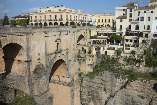 Ronda: es un municipio y localidad de España perteneciente a Andalucía, situada a 100 km al noroeste de la provincia de Málaga. La ciudad se asienta sobre una meseta cortada por un profundo tajo excavado por el río Guadalevín, al que asoman los edificios de su centro histórico, lo que confiere a la ciudad una panorámica pintoresca que, unida a la variedad de monumentos que posee, a su entorno natural y a su cercanía a los grandes centros del turismo de masas de la Costa del Sol, la convierten en un lugar único. La cornisa del tajo y el puente que lo salva son la imagen por antonomasia de la ciudad.