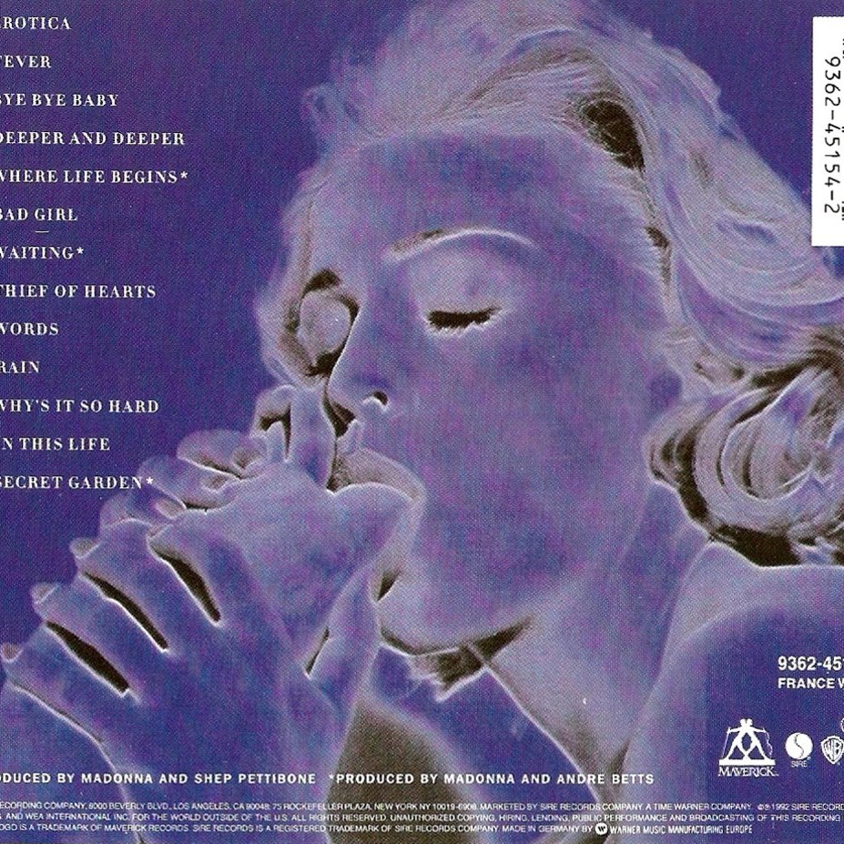 El arte del disco “Erotica” estuvo a cargo del diseñador y artista visual Fabien Baron, quien también diseñaría el arte del single “Erotica” y el libro “Sex”. La fotografía estuvo a cargo de Steven Meisel y se tomaron imágenes de la producción realizada para el libro. En la tapa del disco se muestra una foto de primer plano del rostro de Madonna, totalmente saturada dando una blancura absoluta para la piel con los detalles de los ojos y la boca en azul. En la contratapa vemos otra imagen saturada en azul en donde Madonna posa chupando el dedo de un pie. En el interior, se diseñó un booklet con varias imágenes con diferentes tratamientos para darle un estilo gastado, viejo y decadente con superposición de figuras, rasguños, cortes, etc. Todas las fotos son tomadas por Steven Meisel para el libro “Sex”.