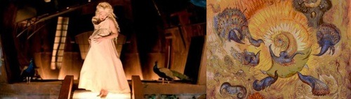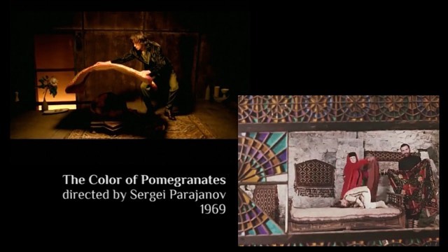 «The Color of Pommegranates» es un film de 1969 del director armenio Sergei Paradjanov es una de las obras más representativas del cine surrealista. Ahora muy en voga debido a que la cantante Lady Gaga, tomó este film para inspirarse casi al detalle en su nuevo video «911», Madonna ya lo había utilizado como inspiración para «Bedtime Story«… ¿casualidad?. Escenas de este film lo vemos al inicio cuando hay un cambio de cetros desde dos manos y en la escena en donde se ve un pie aplastando un racimo de uvas sobre una placa con inscripciones. La escena es casi idéntica, salvo en las inscripciones de la piedra, en donde en el video se lee parte de la letra de la canción en hebreo. Las uvas representan el regalo divino del que se hace el vino, que representa la sangre de Cristo.