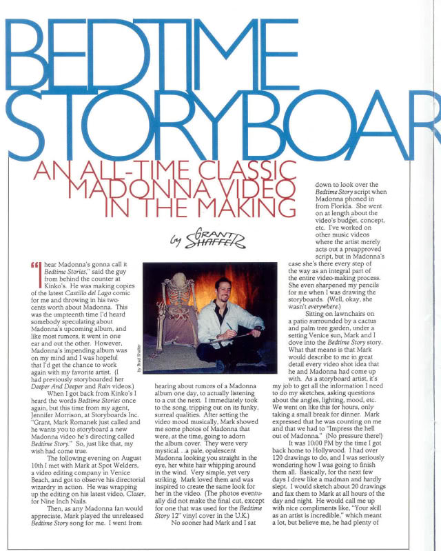 «Escuché que Madonna lo llamará Bedtime Stories», dijo el tipo detrás del mostrador de Kinkos. Estaba haciendo copias del último cómic de «Castillo del Lago» hecho por mí y aportando sus chismes sobre Madonna. Esta era la enésima vez que escuchaba a alguien especular sobre el próximo álbum de Madonna y, como la mayoría de los rumores, entró por un oído y salió por el otro. Sin embargo, el inminente álbum de Madonna estaba en mi mente y tenía la esperanza de tener la oportunidad de trabajar nuevamente con mi artista favorita (previamente había realizado los storyboard para sus videos «Deeper And Deeper» y «Rain»). Cuando regresé de Kinko’s escuché las palabras «Bedtime Stories» otra vez, pero ahora por mi agente Jennifer Morrison de Storyboard.Inc: «Grant, Mark Romanek acaba de llamar y quiere que realices el storyboard de un nuevo video de Madonna que está dirigiendo llamado ‘Bedtime Story'». Así que así de simple, mi sueño se había hecho realidad.