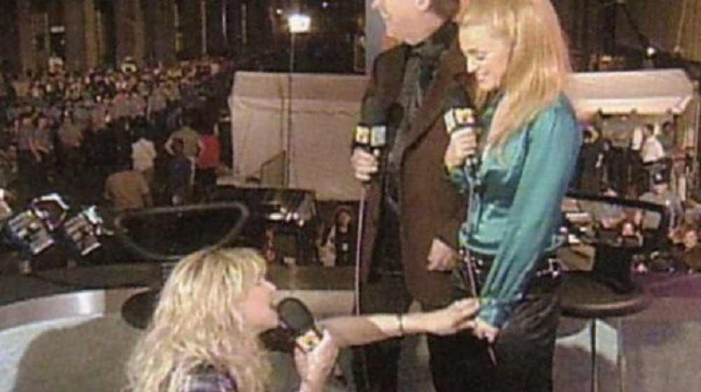 Luego de la ceremonia, Madonna dio una entrevista para la MTV a cargo de Kurt Loder. Lo que parecía una entrevista más se convertiría luego en uno de los momentos bizarros de la historia de la canal y siendo una de las situaciones más incómodas vividas por Madonna en televisión. Mientras la diva se preparaba para comentar sobre su próximo proyecto, el disco de baladas «Something to Remember», de repente comienzan volar elementos sobre la plataforma en la que se encontraba (alguien tiró un estuche de polvo compacto que casi le pega en la cabeza). Ante la sorpresa, la cantante y el conductor miran hacia y abajo y ven a una exaltada Courtney Love gritando por Madonna quien comentó: «Courtney Love está necesitando mucha atención ahora». Loder no quiso perderse la oportunidad de unir a estas dos estrellas e invitó a Love a subir a la plataforma ante una Madonna que insistía; «por favor, no lo hagas». Love subió, saludó con toda su extravagancia y descaradamente empezó a interrumpir la entrevista. Madonna trató de comportarse como una dama ante los misiles que Love tiraba contínuamente alegando que ella la «había tratado mal» (se dice que la enemistad entre ambas viene desde 1994 cuando Madonna se negó a contratar a Love para Maverick; aunque Love refiere que la Reina del Pop había intentado seducir a Kurt Cobain). «Jamás traté mal ni hablé mal de nadie» respondió Madonna intentando mantener la calma para luego cambiar de tema y hablar sobre su ropa y la moda. La situación terminó bien gracias a la intervención de Liz Rosenberg quien irrumpió en la entrevista para tomar del brazo a Madonna y sacarla del lugar. Madonna despidió amorosamente a Courtney Love con un beso en la mejilla y le dijo «cuídate mucho». Madonna abandona el lugar y Courtney Love se queda para una entrevista ella sola jamás planeada: «me gusta entrar a lo grande» comentó irónicamente.