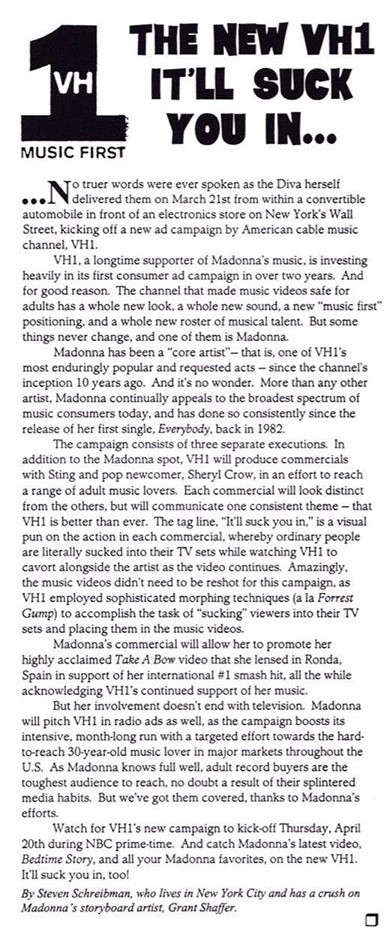En Marzo de 1995, la cadena de televisión de música VH1 había preparado un re-lanzamiento de su canal con una nueva imagen, nuevos contenidos y sobre todo con nuevas inclusiones con el objetivo de atraer a un público más adulto. El canal no escatimó en gastos cuando tuvo que realizar la promoción de su nueva imagen. Se realizaron varios spots televisivos de aproximadamente 30 segundos de duración con la presencia de Madonna, Cheryl Crown y Sting todos enlazados con el slogan «VH1 It’ll Suck You In» («VH1 te chupará») haciendo referencia que la audiencia quedaría inmersa dentro del contenido del canal. El comercial grabado por Madonna se había planificado para el 17 de Marzo pero por problemas de agenda tuvo que ser pospuesto para el 21 del mismo mes y se filmó en un cajero automático de Wall Street en New York. En el corto, se intentó recrear la atmósfera del exitoso video clip «Take a Bow» (el que también aparecería en el comercial), todo el vestuario de Madonna fue traído especialmente desde la Casa Galliano de París, Versace, Prada y estuvo a cargo de Lori Goldstein; su maquillaje por Laura Mercier y peinado se realizó de manera idéntica al de su videoclip. También se contó con un coche Porsche vintage para simular el coche que aparece en el video. Además de este comercial de televisión, Madonna grabó varios comerciales para radio también.