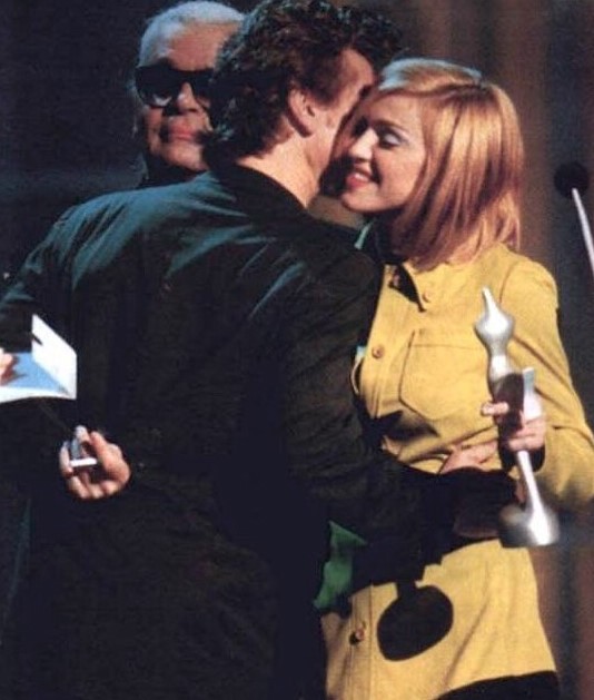 Luego, el premio para «Most Fashionable Artist» fue presentado por Karl Lagerfeld y la super modelo Claudia Schiffer en la categoría se encontraban: Elton John, Seal, Annie Lennox, Sting y Madonna. Por supuesto, ya sabemos quien fue la ganadora. Esta vez, la cantante subió a recibir su premio con un traje de pantalón y saco cruzado color mostaza de Gucci. Pero había una pequeña sorpresa esperándola, alguien la sorprende desde el fondo del escenario para entregar el premio: su ex marido, el actor Sean Penn. Madonna se mostró verdaderamente sorprendida aunque no molesta y luego de dar un apretado y sentido abrazo a Penn, exclamó: «eso fue una jugada muy sucia» (comentario dirigido a los organizadores del evento). En su discurso Madonna dijo: «siempre tuve una extraña alianza con la industria de la moda, a lo largo de mi carrera. Hice muy buenos amigos a lo largo del camino, personal y profesionalmente y quiero tomarme este momento para agradecer a todos ustedes que han sido tan buenos conmigo, desde Jean-Paul Gaultier a Steven Meisel, Orlando Pita a los Versaces y tantos otros que no puedo nombrar porque no tenemos toda la noche. Muchas gracias».