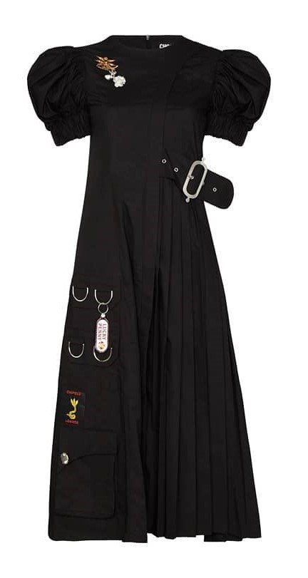 - Vestido de algodón negro cruzado con cinturón y hebilla en la cintura, cuello redondo, mangas abuchonadas y apliques de argollas de metal y broches de Chopova Lowena.