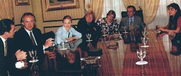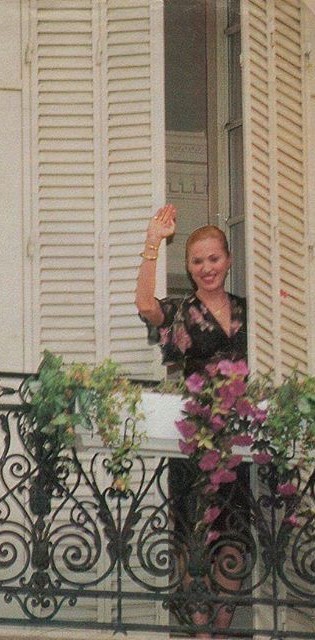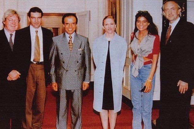 El 23 de Febrero, Madonna junto a Alan Parker, Antonio Banderas y Jonathan Price, se reunieron con el entonces presidente de la Nación, Carlos Menem acompañado por su hija Zulemita para una vista formal en la Quinta Presidencial de Olivos. Pensando que el permiso de filmar en la Casa Rosada sería denegado, Parker había gastado gran cantidad del presupuesto en realizar un balcón ficticio en los estudios de Londres, sin embargo, durante la visita con Menem, Madonna sacó el tema y propuso la filmación en el mítico balcón. El presidente Menem aceptó de inmediato y ofreció utilizar cualquier otro edificio histórico para el film.
