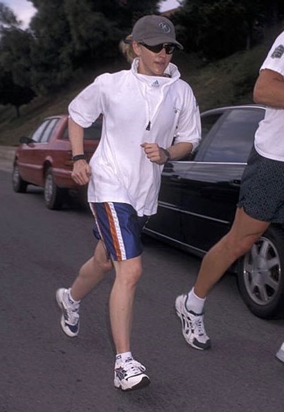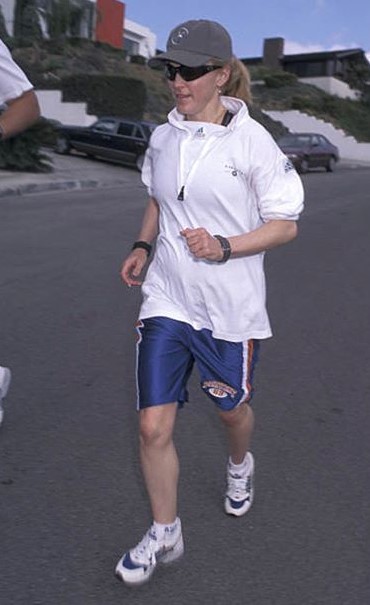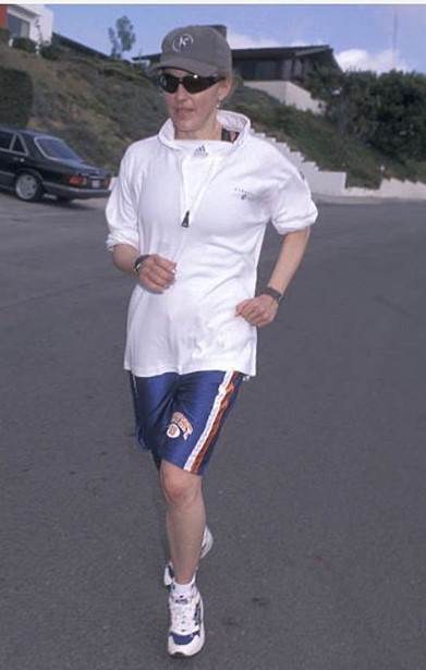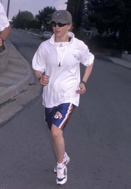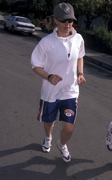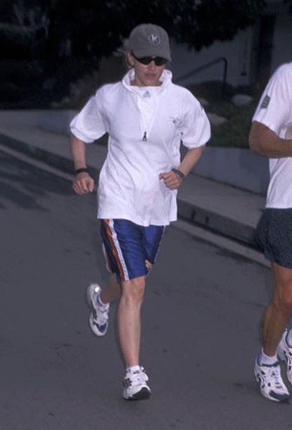 Luego de casi dos meses completos de ausencia en los medios, Madonna comenzó a prepararse para volver al ruedo ya que le esperaba una intensa gira de promoción del film «Evita». Así la vemos, corriendo junto a su entrenador personal por la zona de «Los Feliz» en Los Angeles.